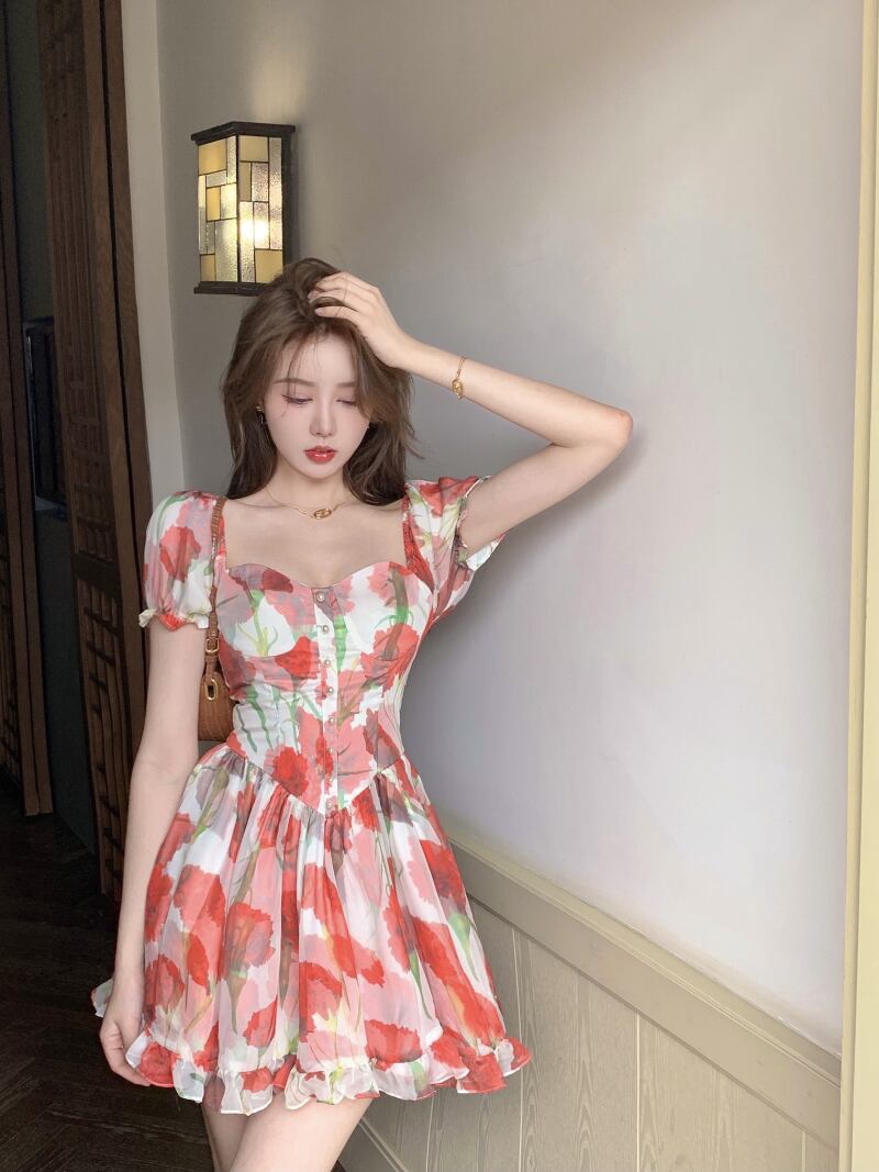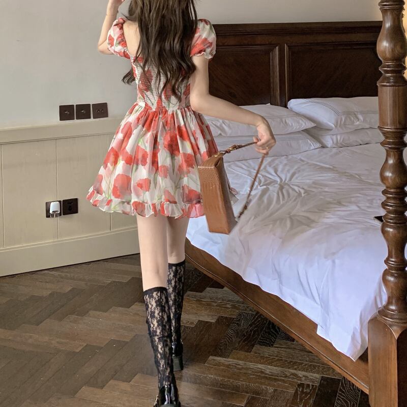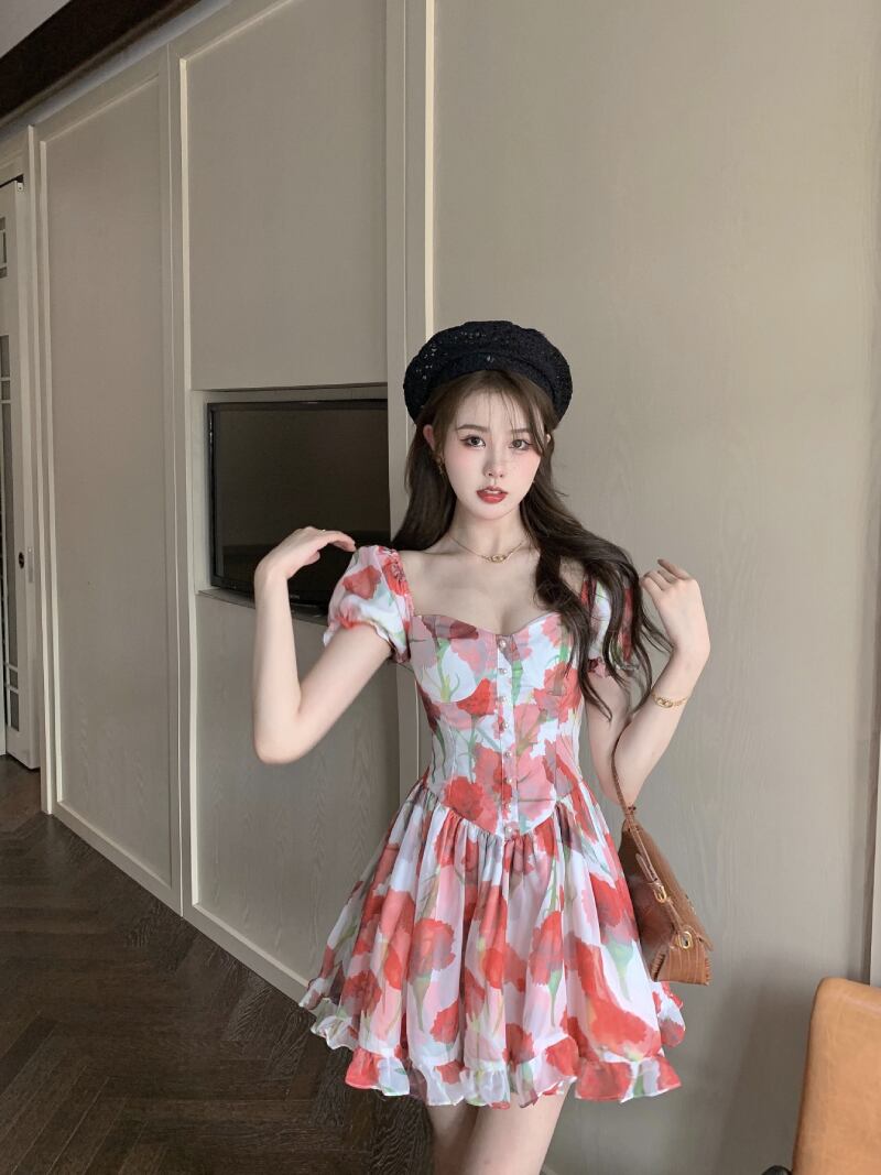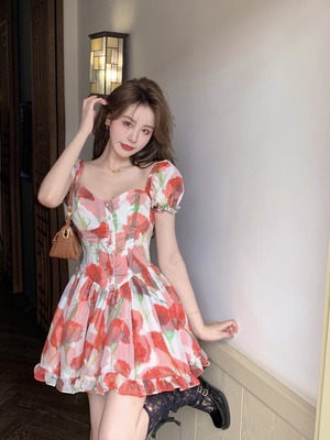 スタイルドレス スリーブプリントシフォンウェストAライン レース 大人ガーリー スウィート キュート カジュアル スクウェア ハンチェンe36122109027