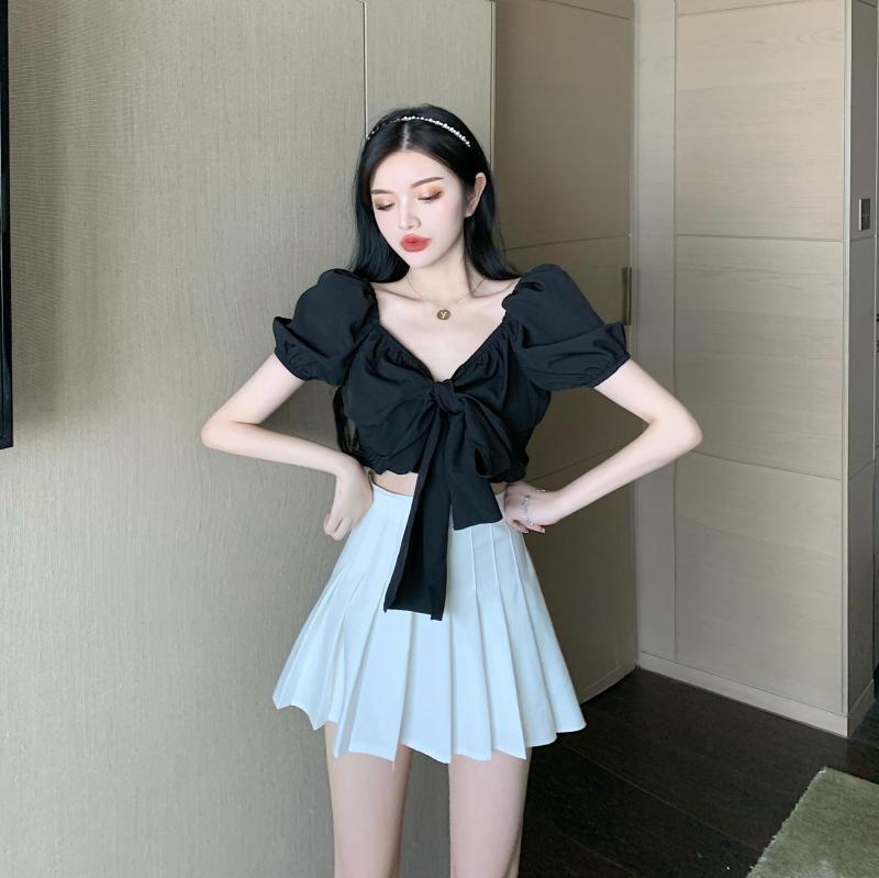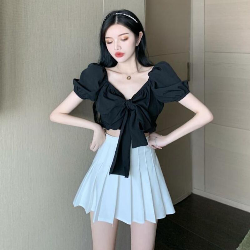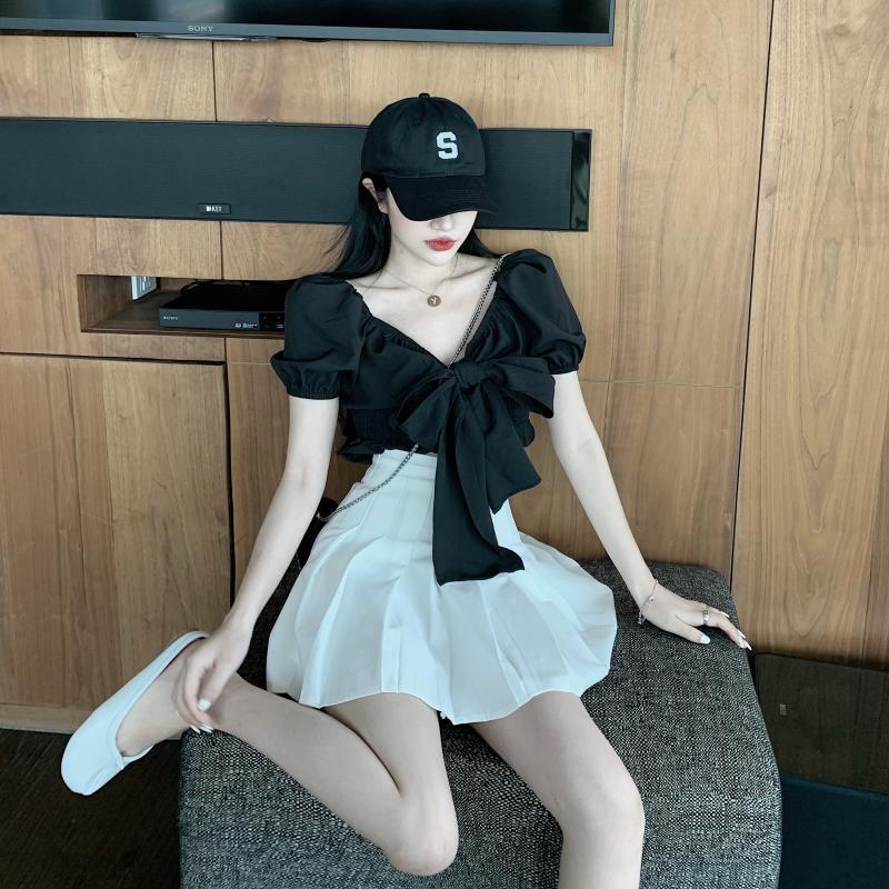 スタンダードサマーButterflyデザイン ショートトップス ハイウェストウェストプリーツスカート レトロ 夏物 ハンチェンe57440187385