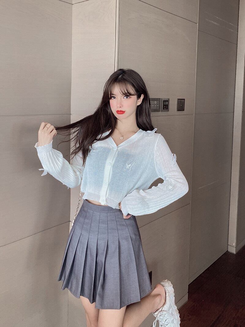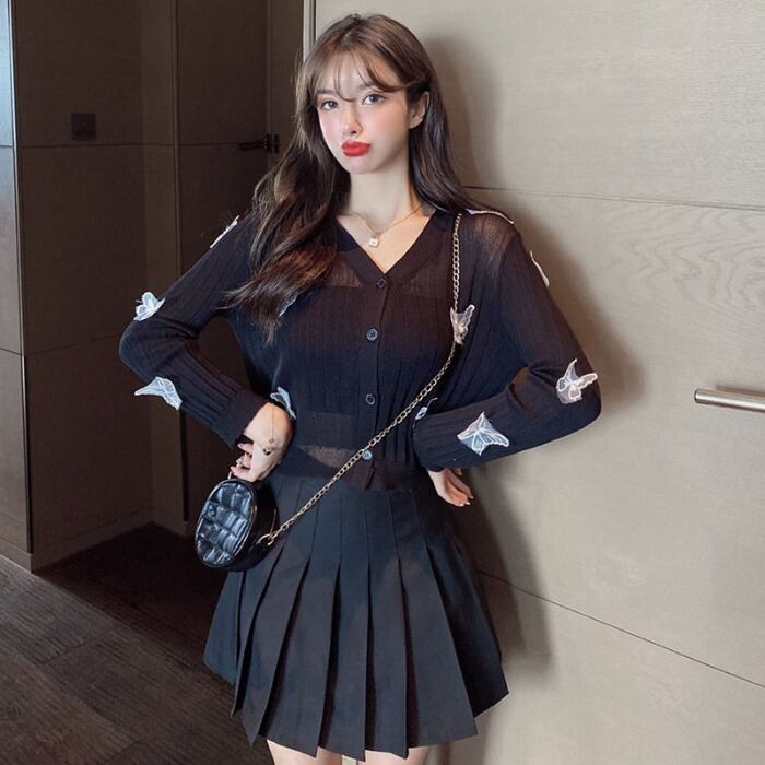 サマーニットカーディガントップス ハイウェストウェストプリーツスカート 夏物 ハンチェンe56462067386