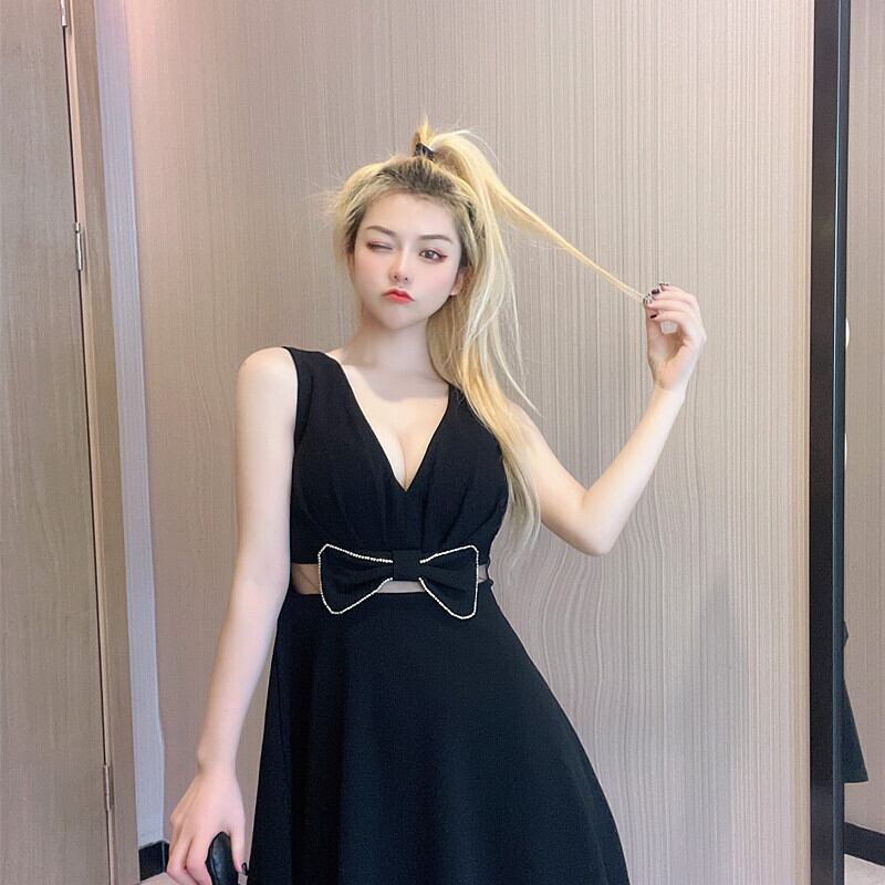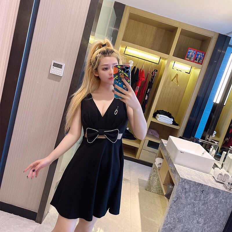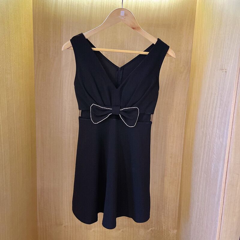 ドレス サマーVネックウェストAラインブラック 夏物 ハンチェンe30740799524