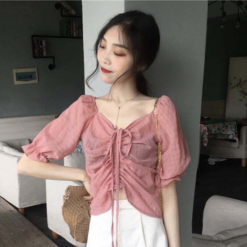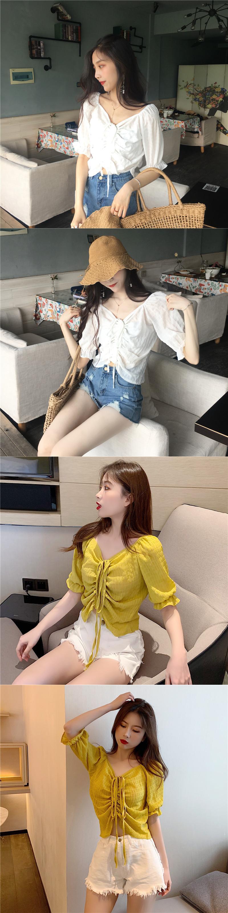 サマーシャツ ギャザーVネックトップス 夏物 ハンチェンe96051792593