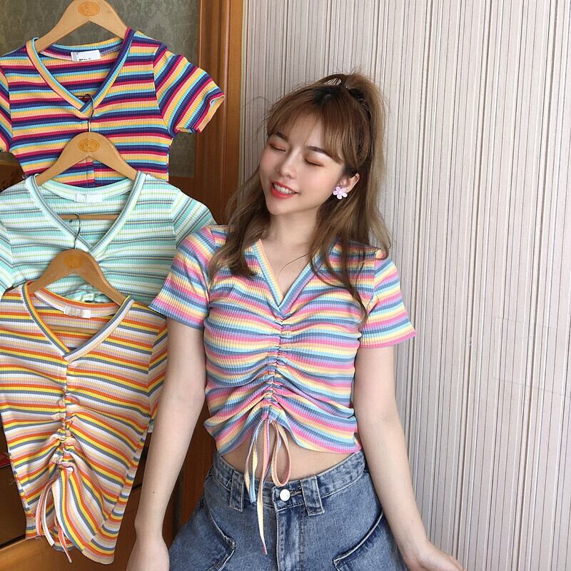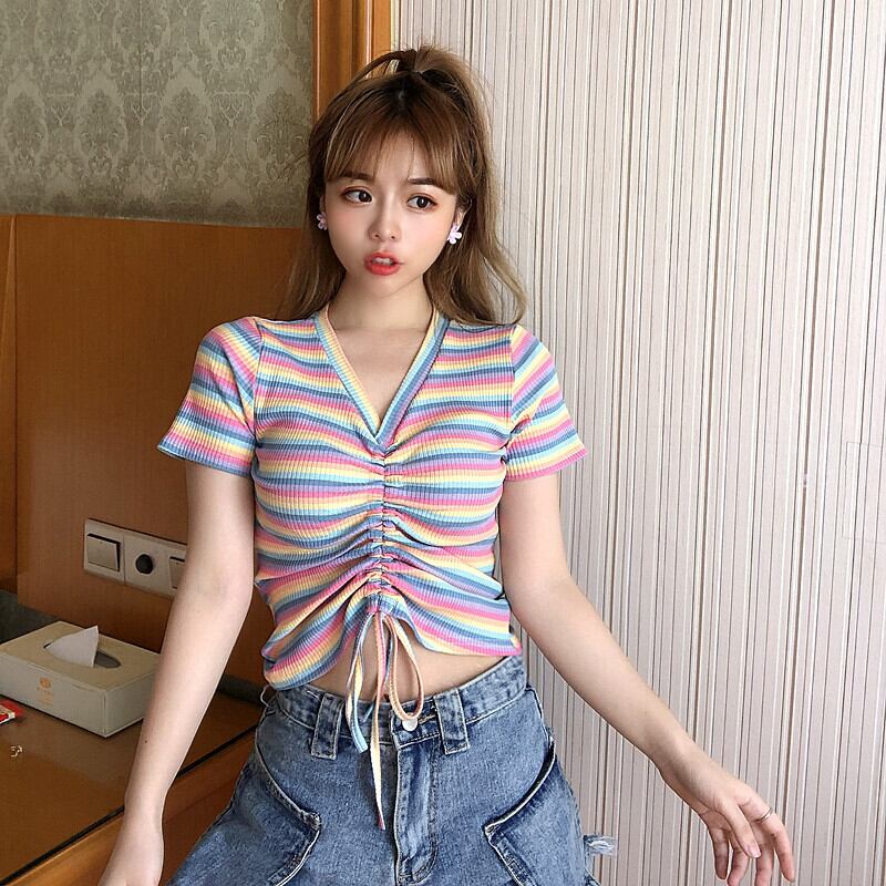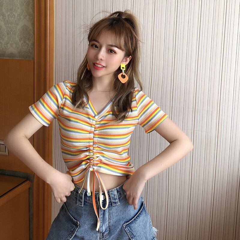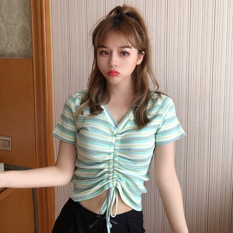 ストライプTシャツ サマーVネックショート薄手トップス 夏物 ハンチェンe81801502315