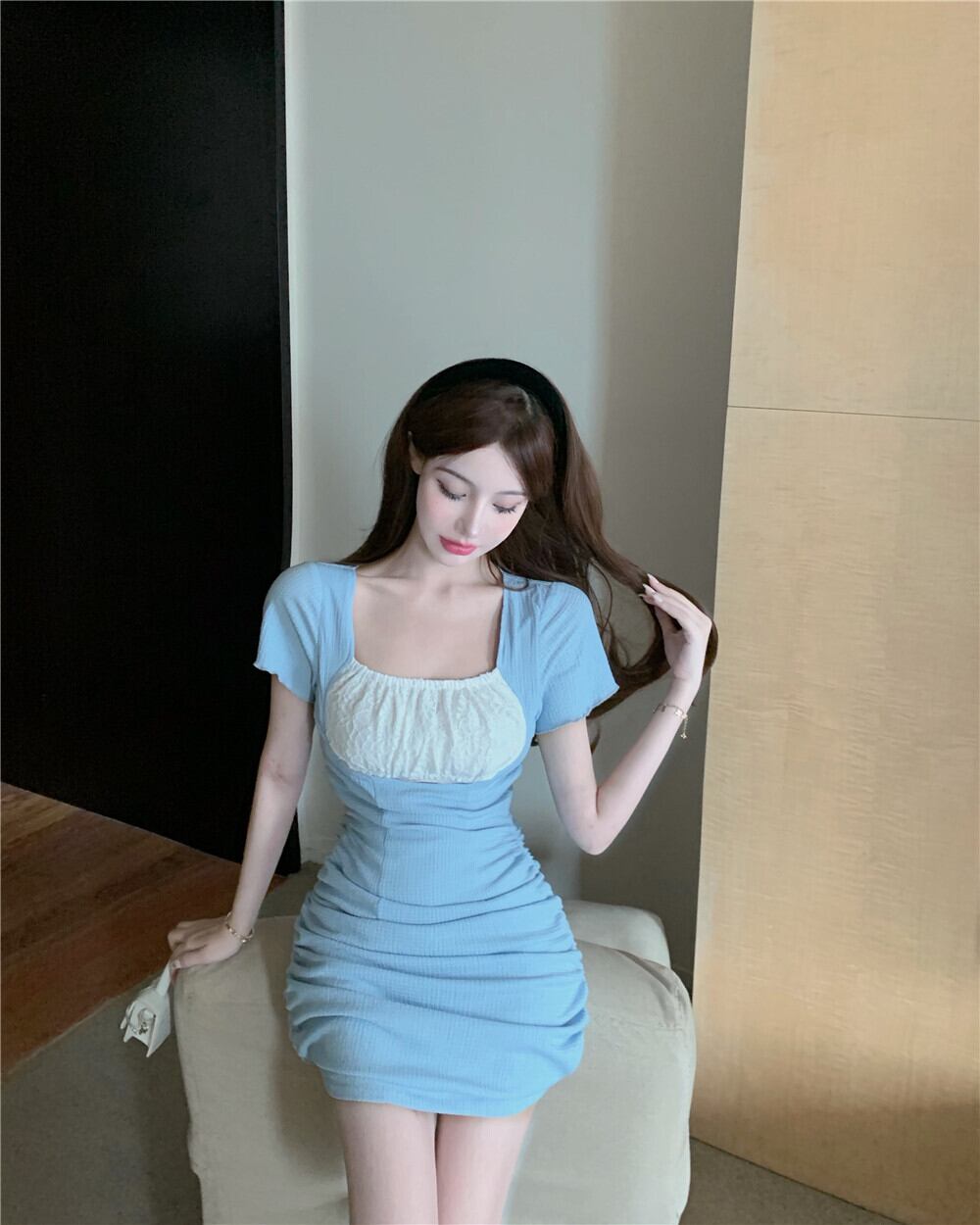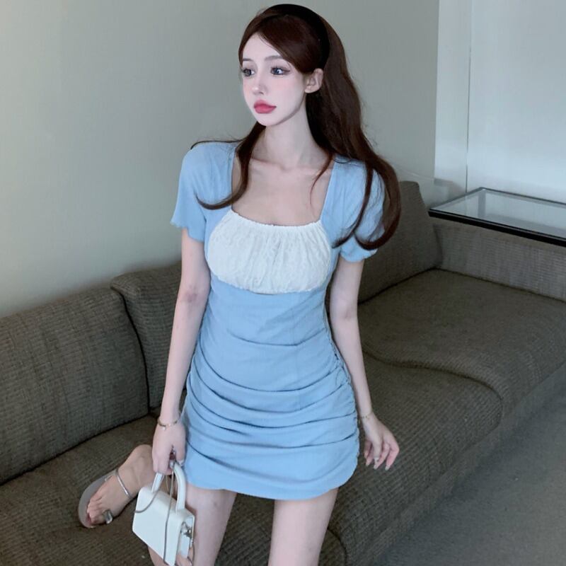 プリーツドレス レディースショートウェスト薄手スカート 半袖 ハーフスリーブ 大人ガーリー スウィート キュート カジュアル スクウェア ハンチェンe29076177085