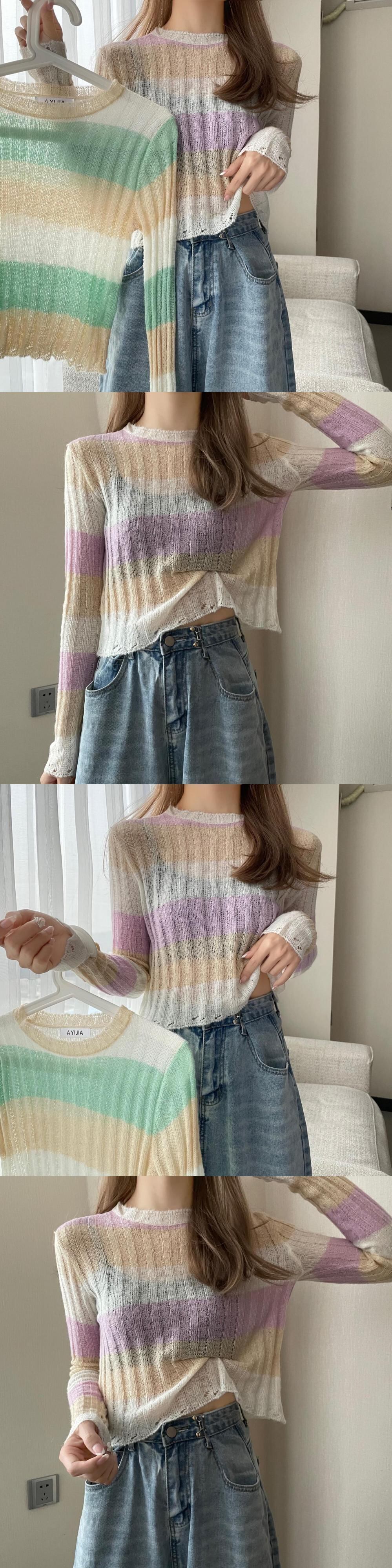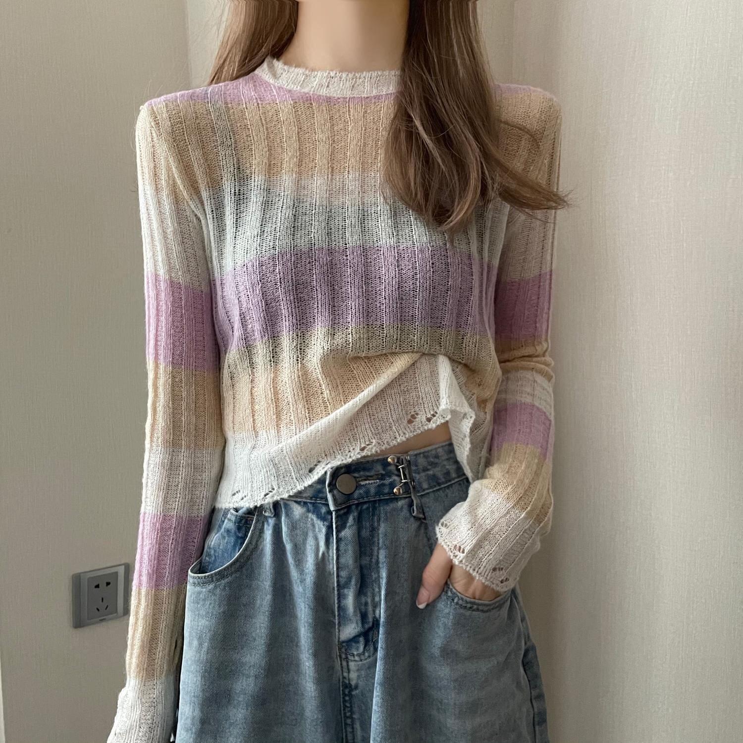 スタイル薄手ニットセーター オータムロングカラーストライプブラウス レディース 長袖 秋物 ハンチェンe88563465328
