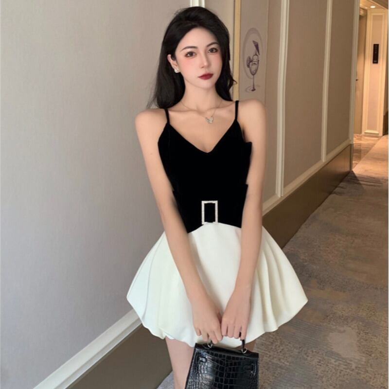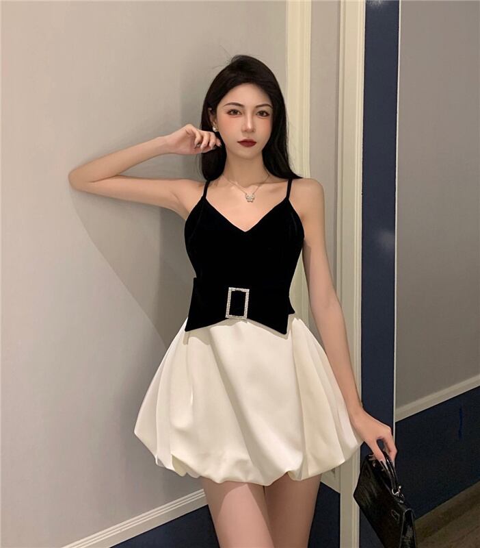 ベルベットVネックドレス スタイルウェスト薄手Aラインショートスカート リボン ハンチェンe98107003659