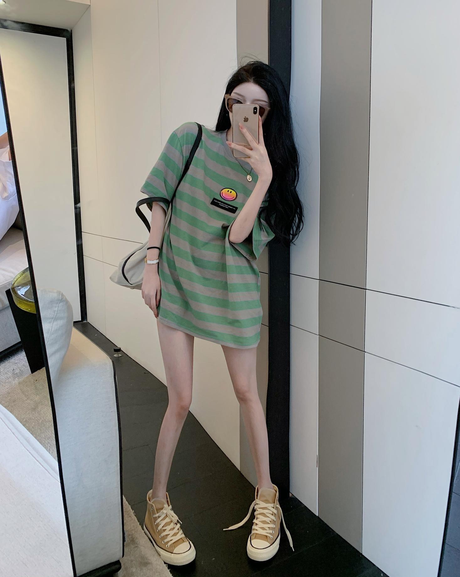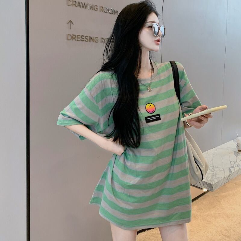 ストライプラウンドネックルーズロングTシャツ トップス レディース Oネック ハンチェンe36987372509