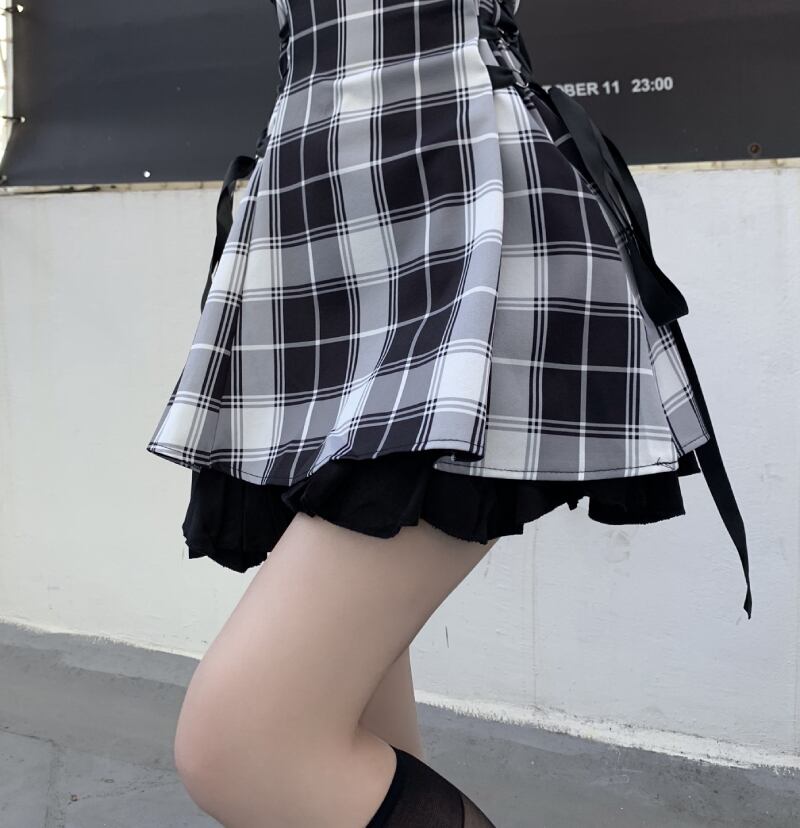 色:白い日焼け止め,チェック柄ホルタースカート,黒キュロット