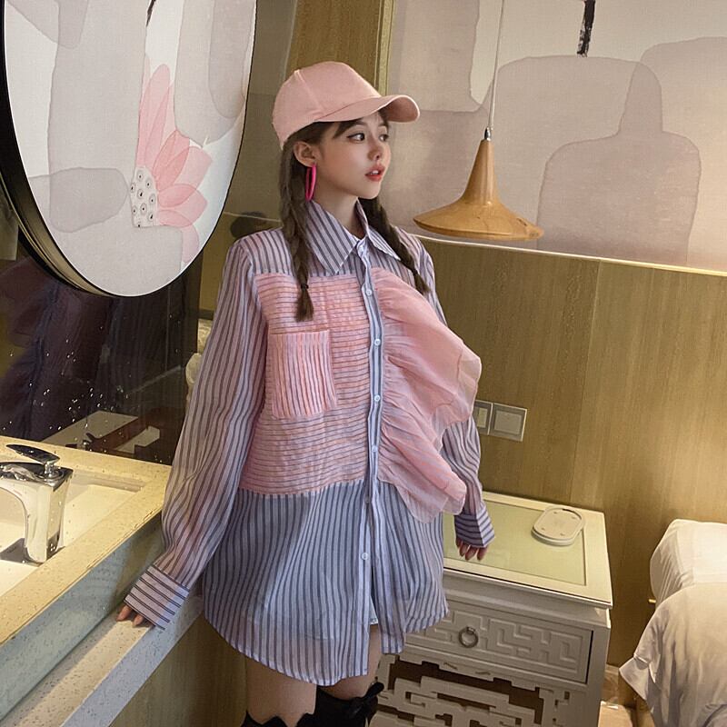 スタイルスタンダードシャツ オータムストライプブラウス ロング レトロ 秋物 ハンチェンe65024994730