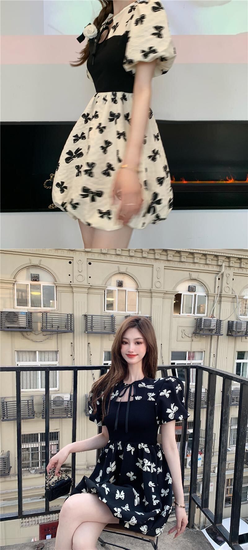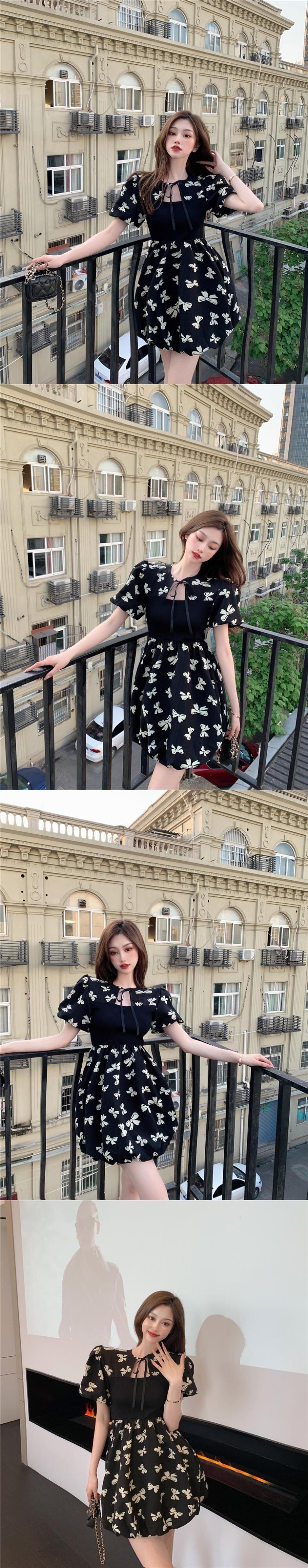 ウェストカラードレス Butterflyデザイン プリント柄ショートスカート ハンチェンe13097544307