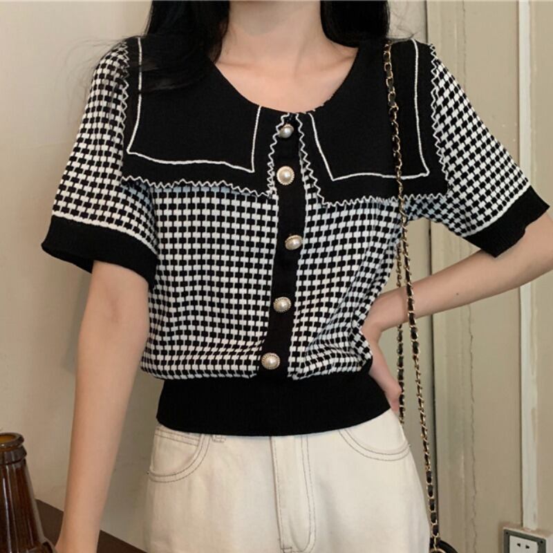カラーネイビーセーター レディーススタンダード格子柄ブラウス レトロ ハンチェンe84967968686