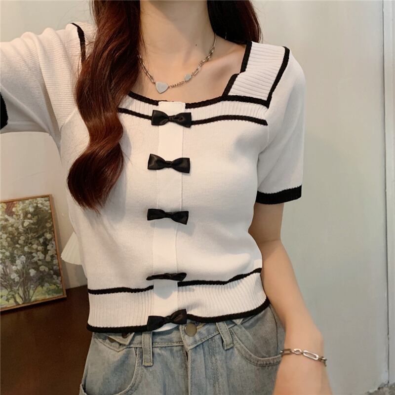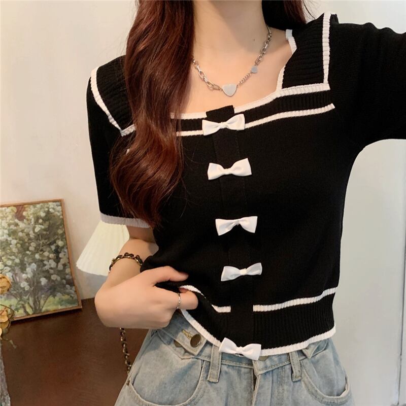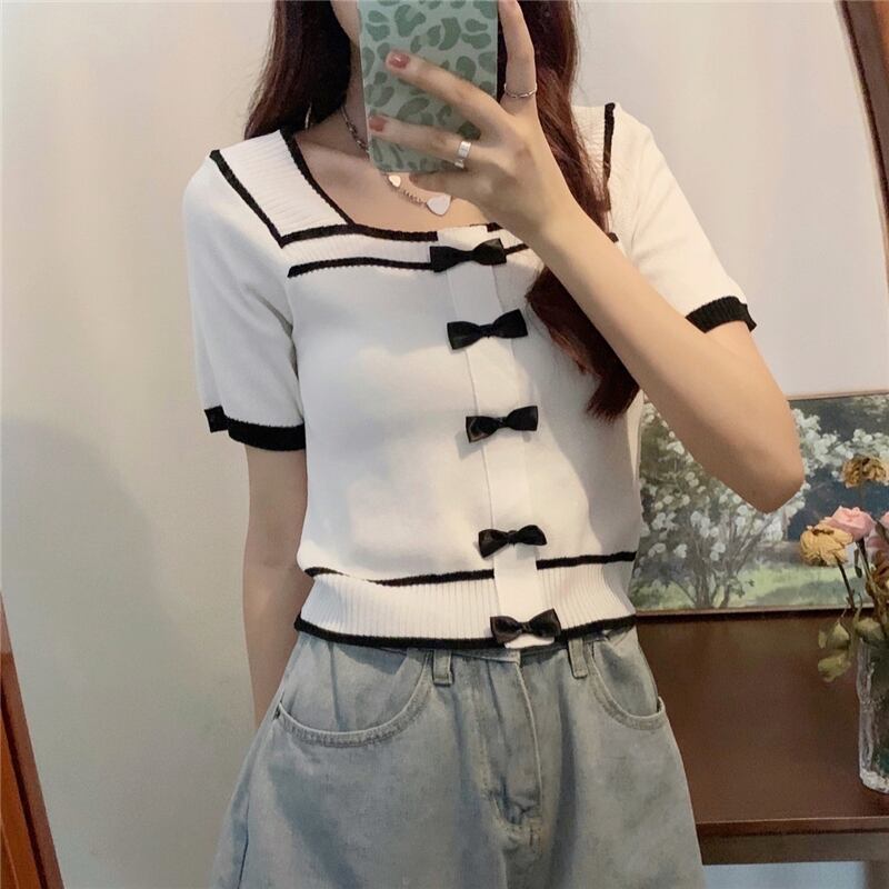 リボンセーター レディーススタイルスリムクロップドトップス シルク スクウェア ハンチェンe15114179583