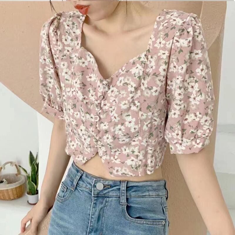 スタンダードフローラルシフォンシャツ スリムクロップドトップス レトロ 花柄 スクウェア ハンチェンe66700434889
