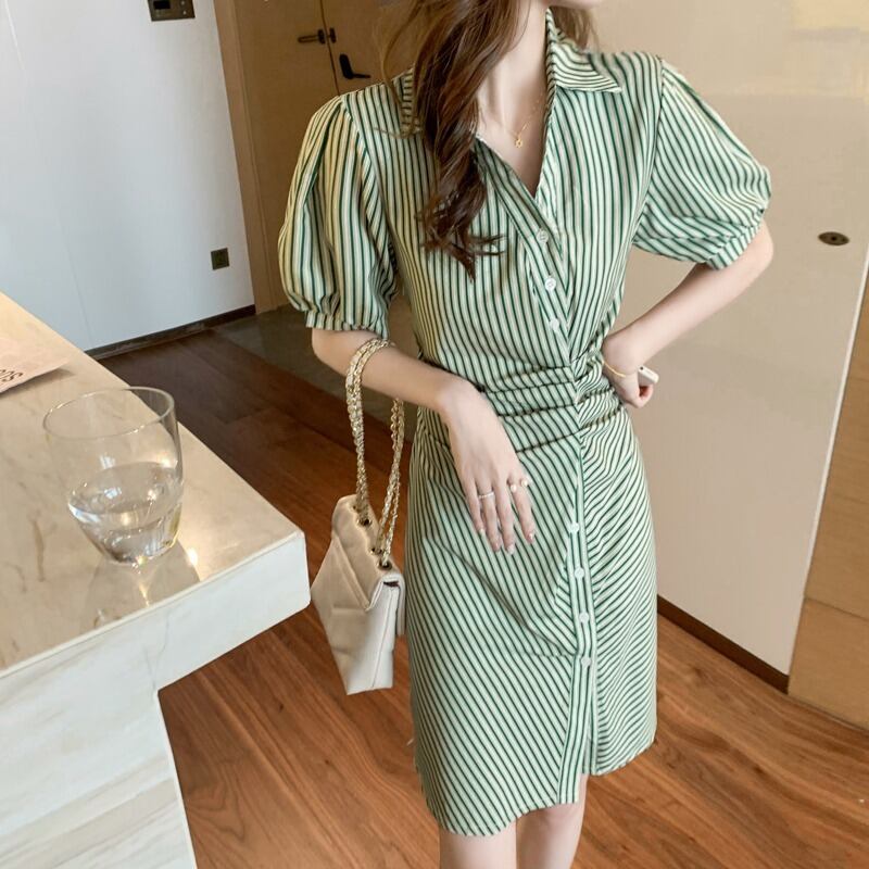 ストライプドレス レディーススタンダードスリーブウェストスリムショートスカート レトロ ハンチェンe78521113230