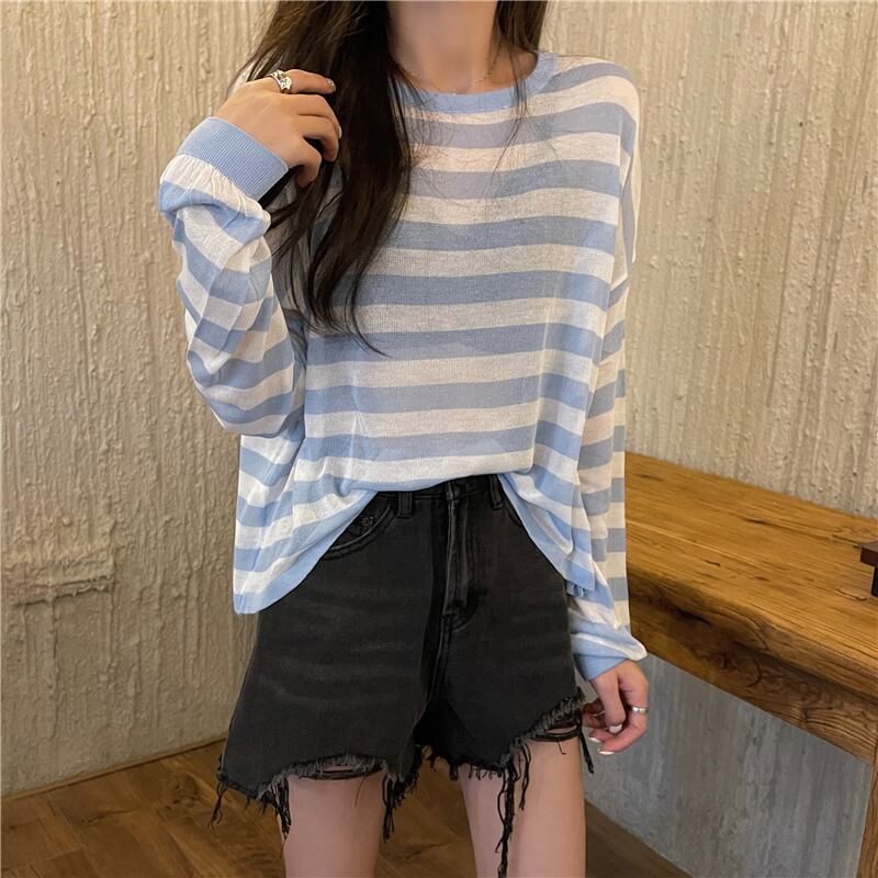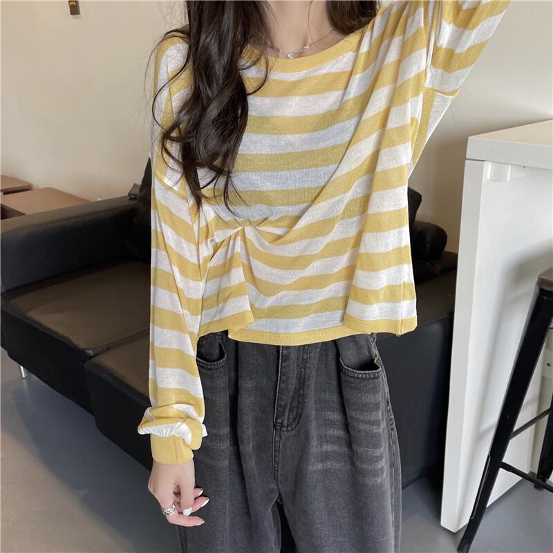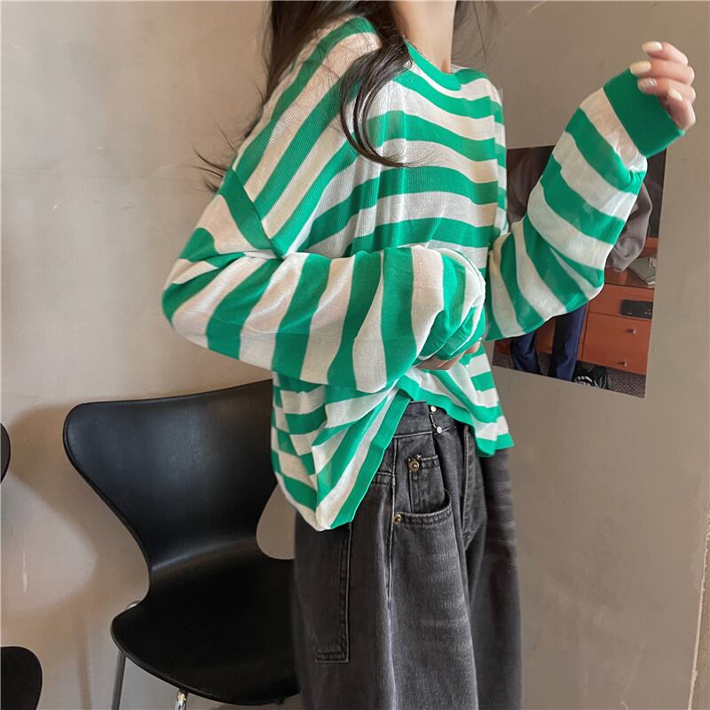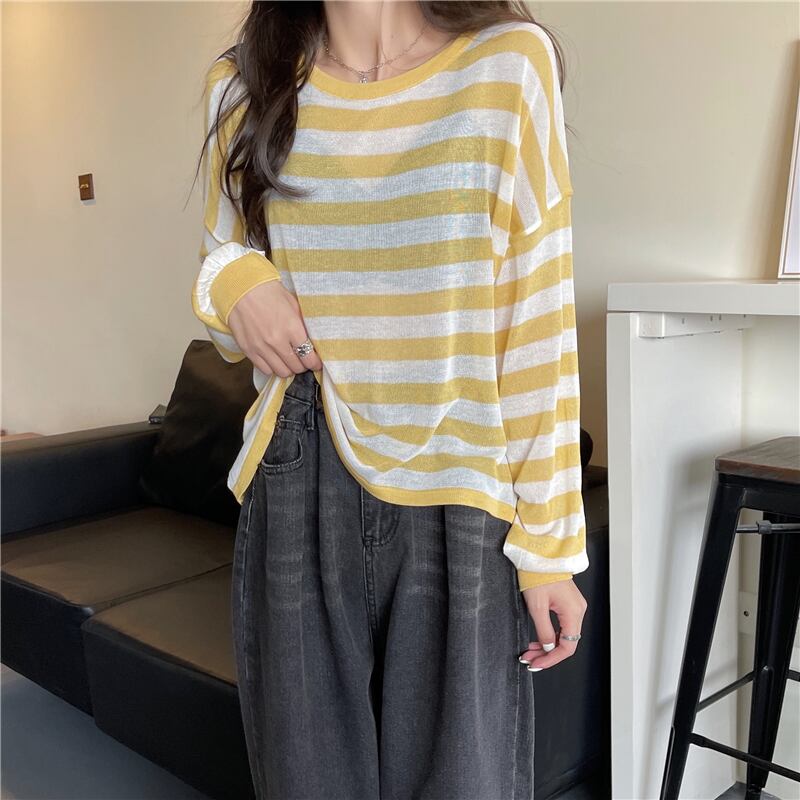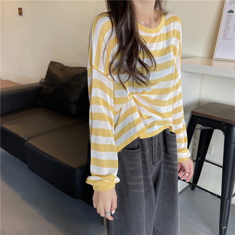 ストライプ薄手ルーズニットセーター オータムトップス レディース ロング 秋物 ハンチェンe82709148939