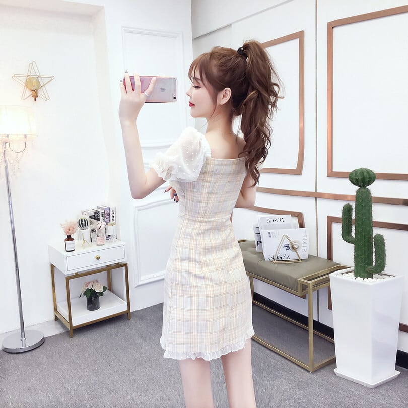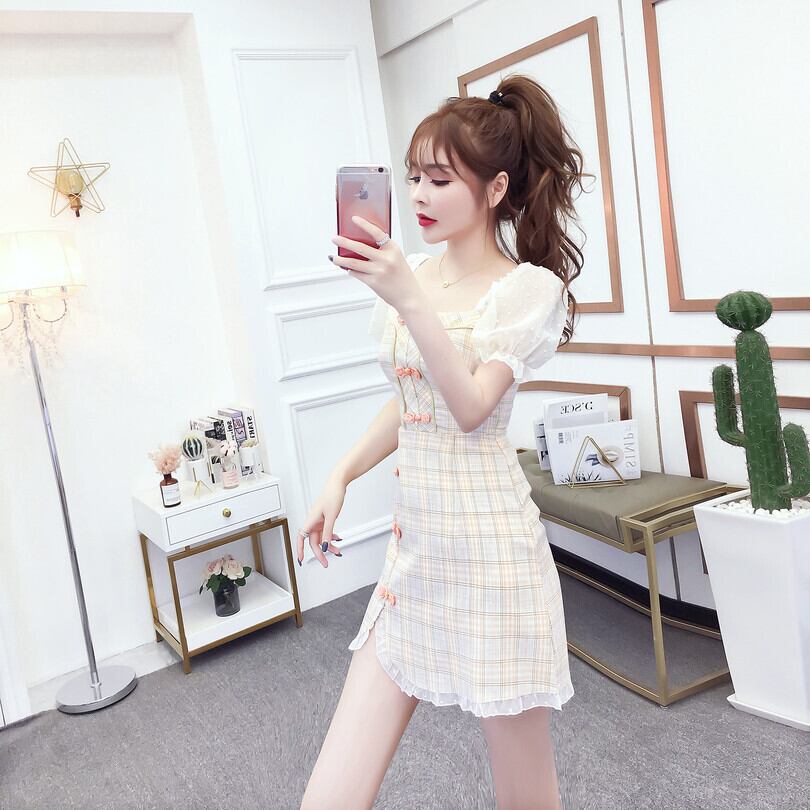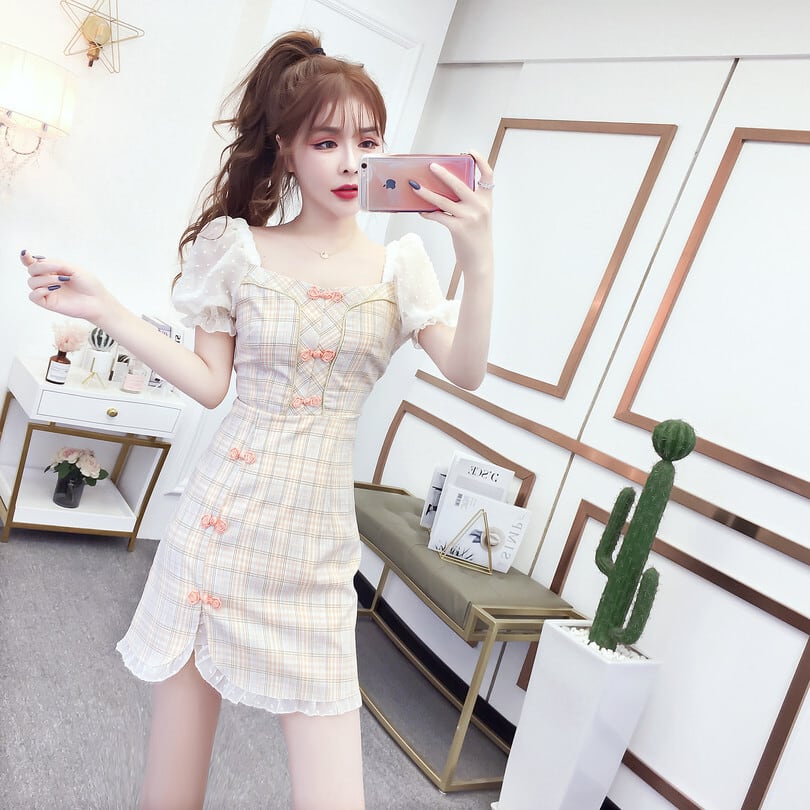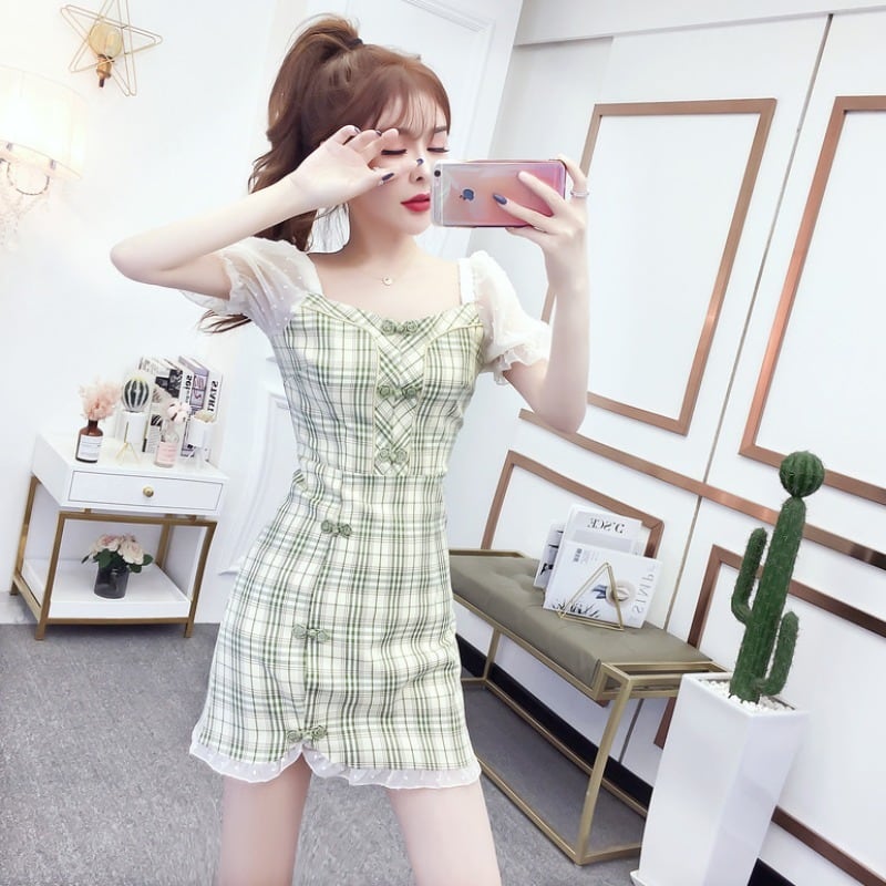 スタンダード格子柄バックルレーススリーブドレス レディース レトロ ステッチ ハンチェンe25565077947