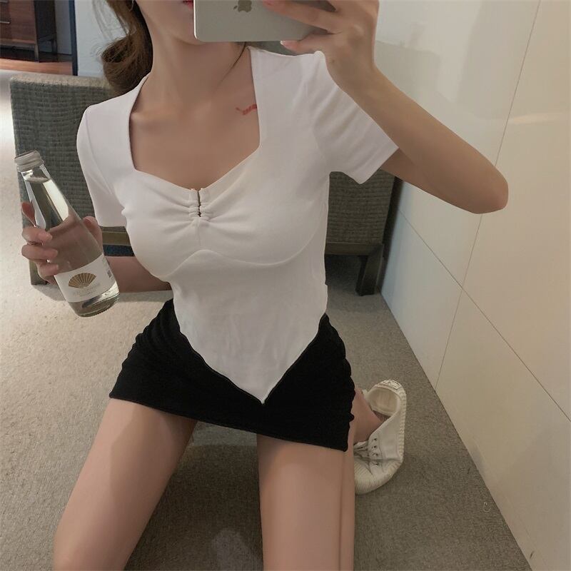 スリムTシャツ 薄手ソリッド カラーブラウス レディース ソリッドカラー スクウェア ハンチェンe45028594194