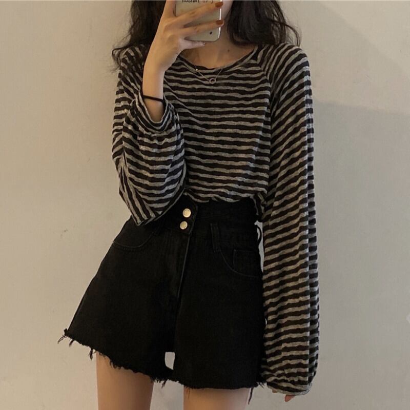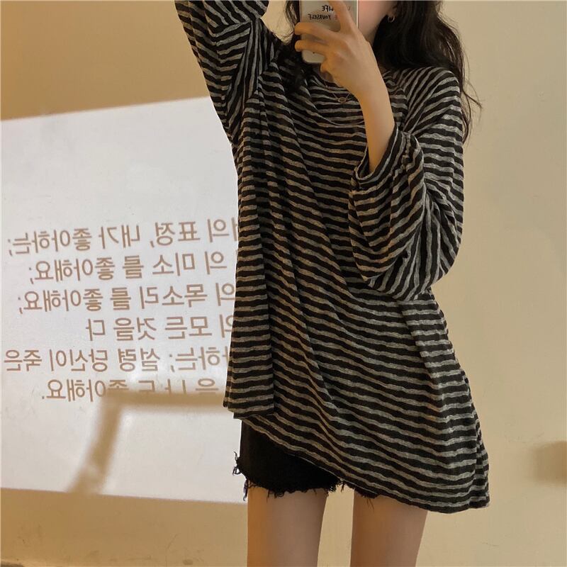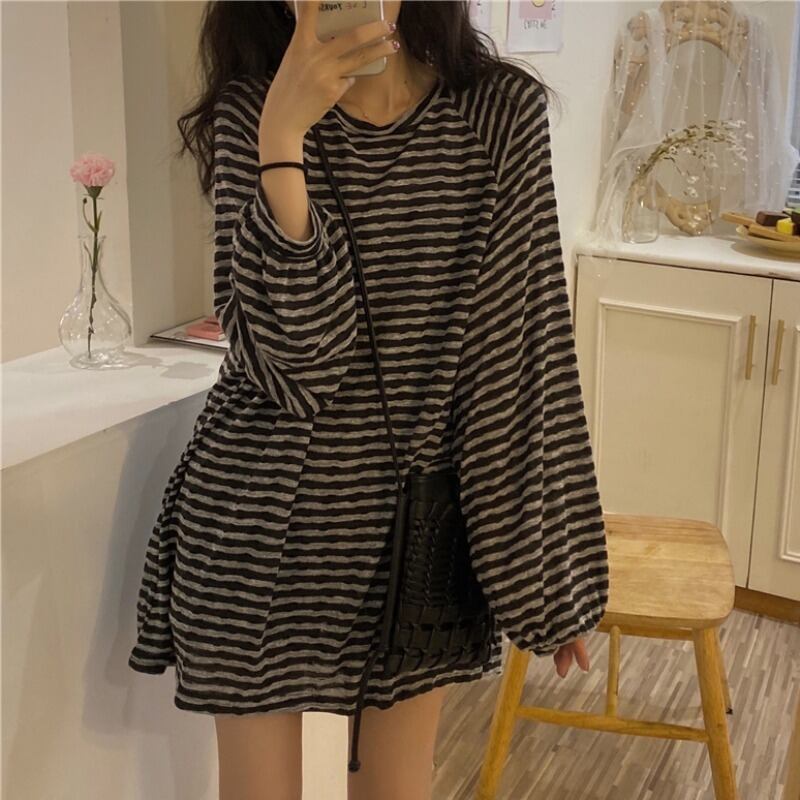 オータムルーズ薄手ラウンドネックカジュアルストライプTシャツ トップス ロング 秋物 Oネック ハンチェンe53278172064