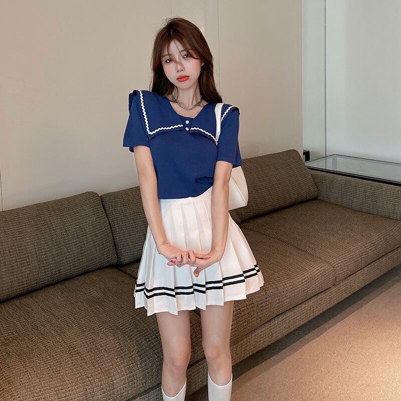 ネイビーカラーセーター ハイウェストウェストプリーツスカート ハンチェンe35164380558