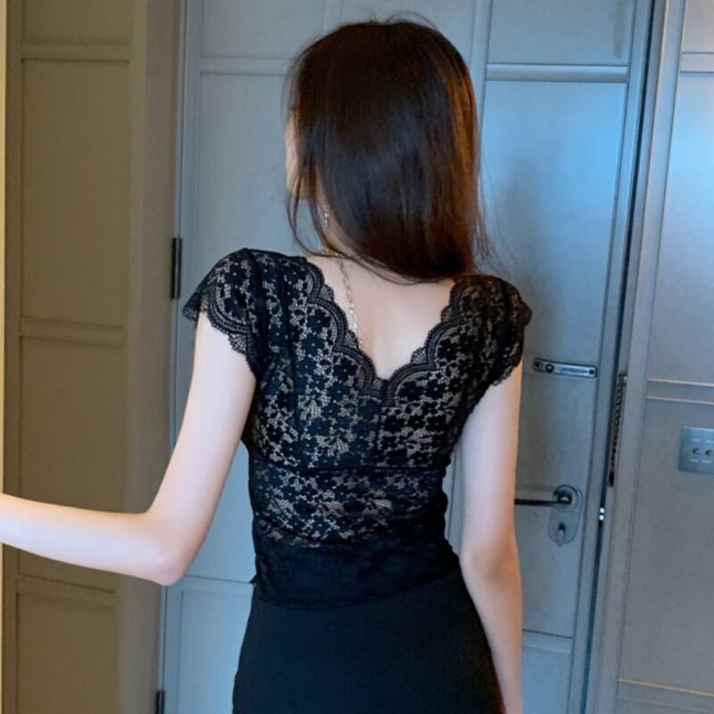 レースシャツ Vネックスリムショートトップス レディース ハンチェンe6168713727