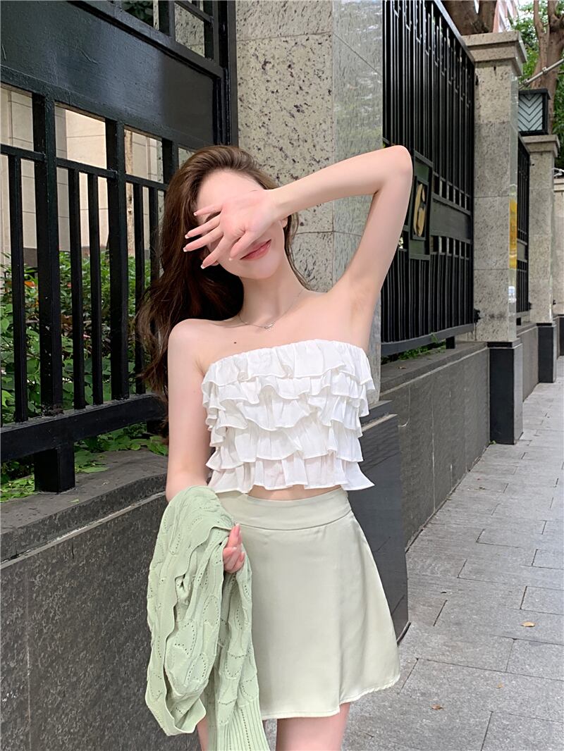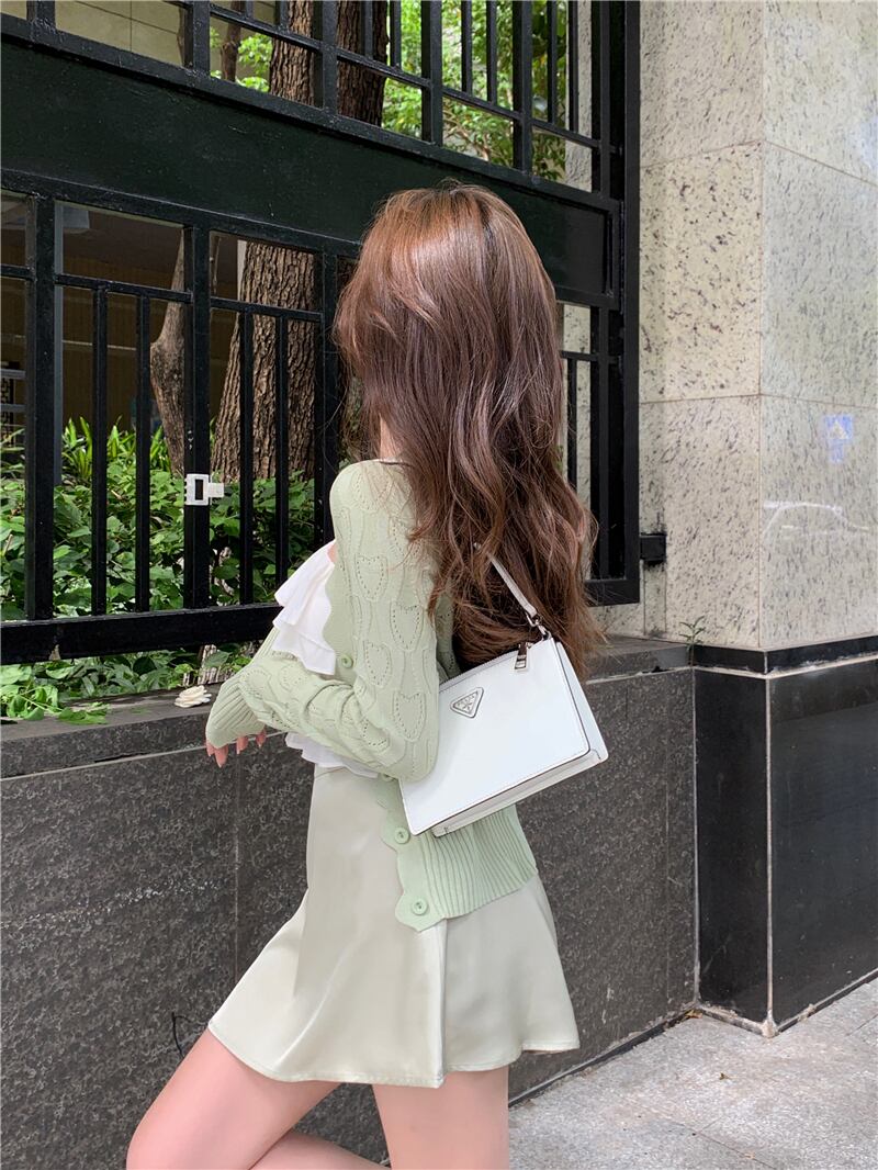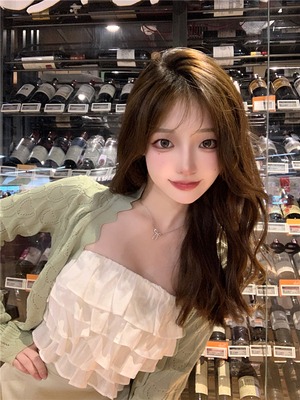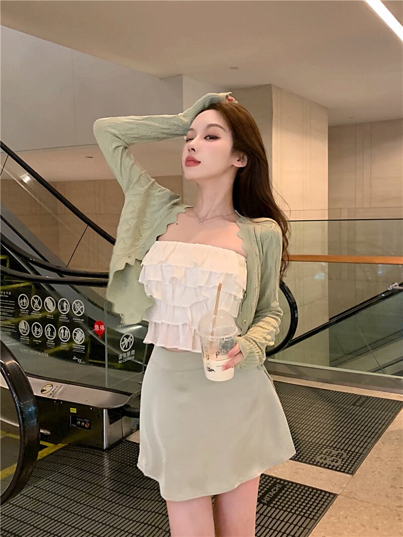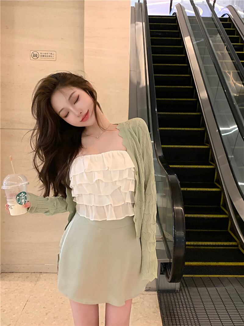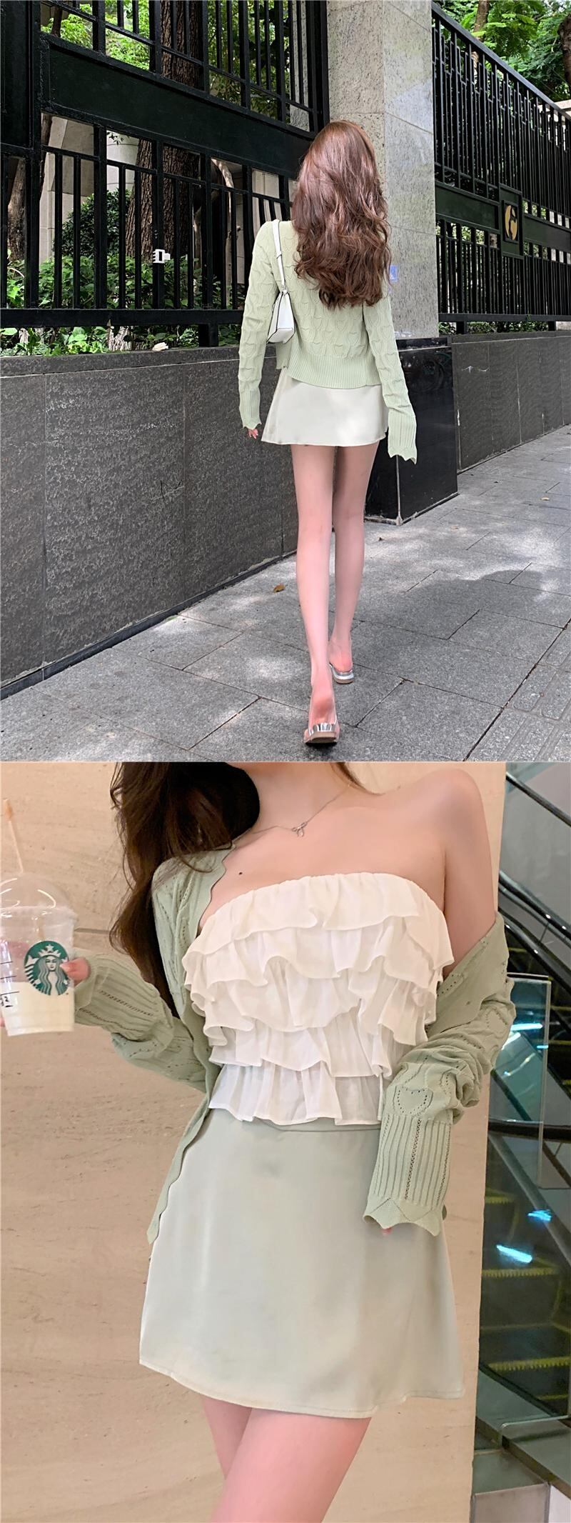 色:グリーンカーディガン,白いチューブトップ,緑のスカート
