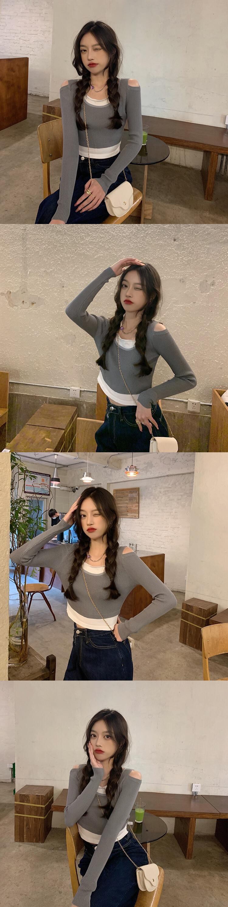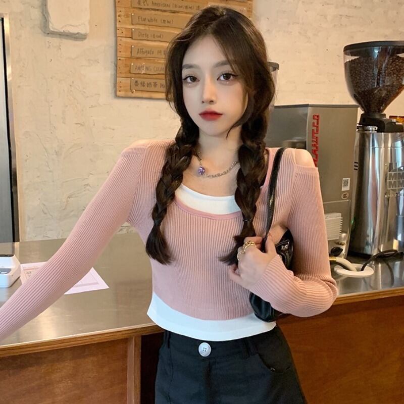 オータムスタイルストラップレススリムショートニットセーター トップス レディース ロング 秋物 ハンチェンe22370327544
