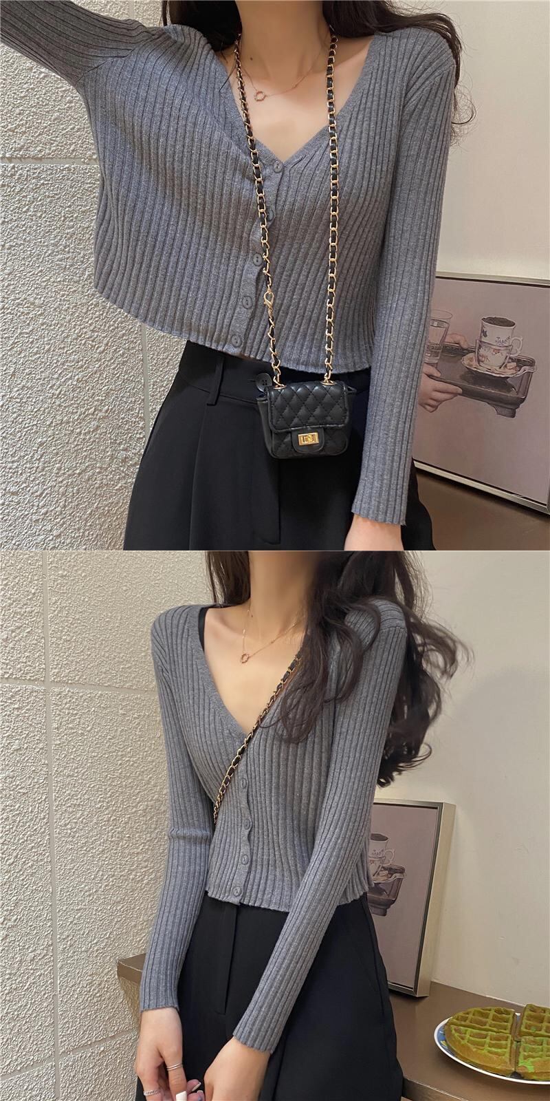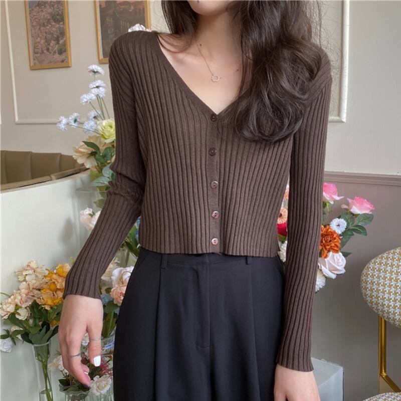 オータムスタイルスタンダードVネックニットカーディガンショートトップス ロング レトロ 秋物 ハンチェンe47421262976
