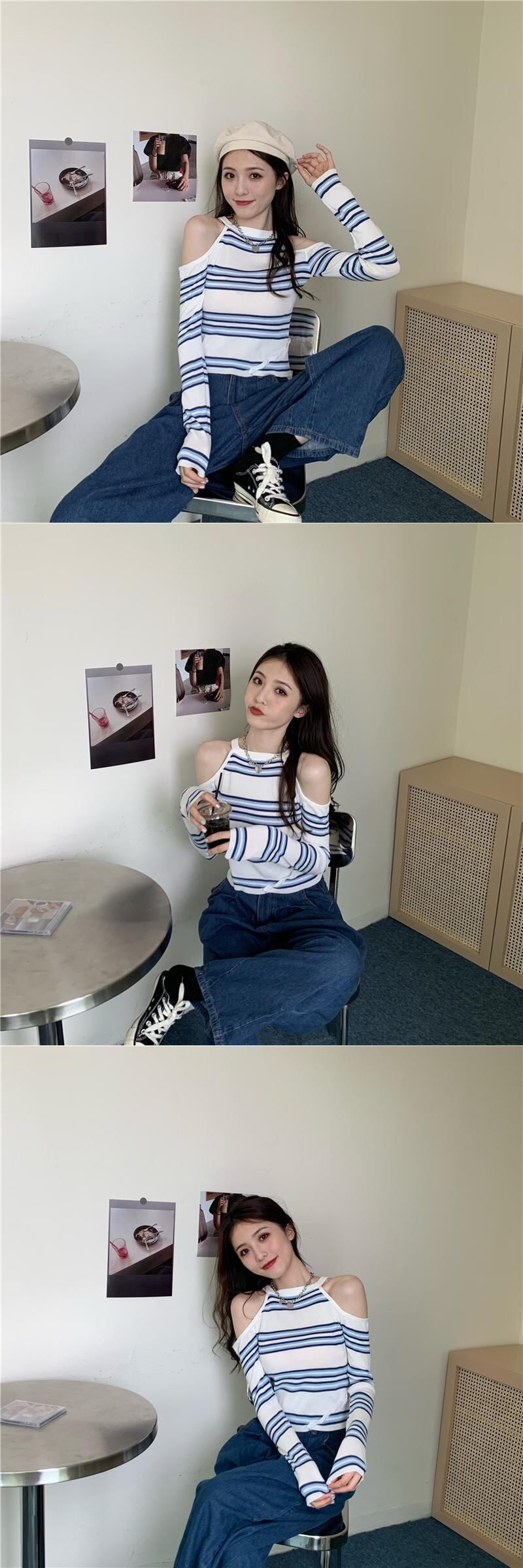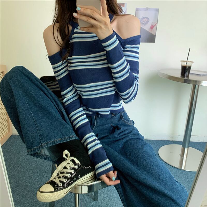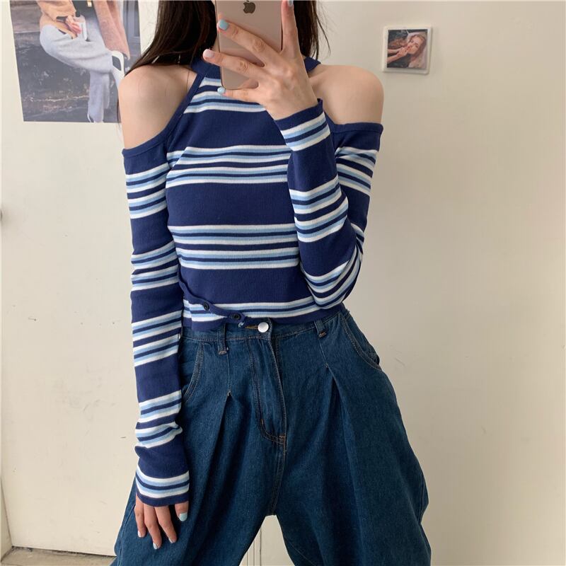 ストライプセーター オータムスタイルホルターストラップレススリムショートブラウス レディース ロング 秋物 ハンチェンe73482517800