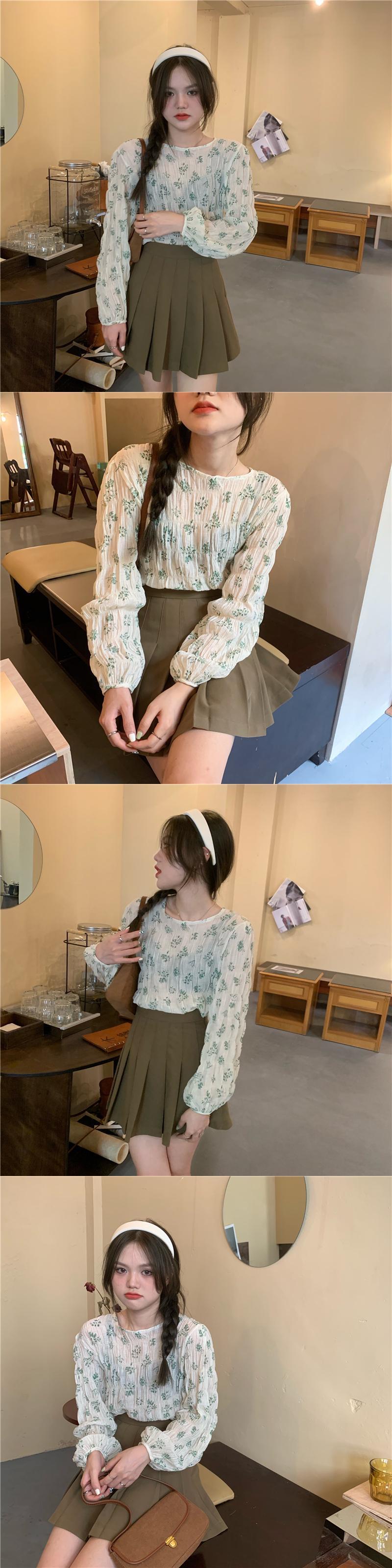 ラウンドネックフローラル薄手シフォンシャツ ショートブラウス ロング 花柄 Oネック ハンチェンe20300691645