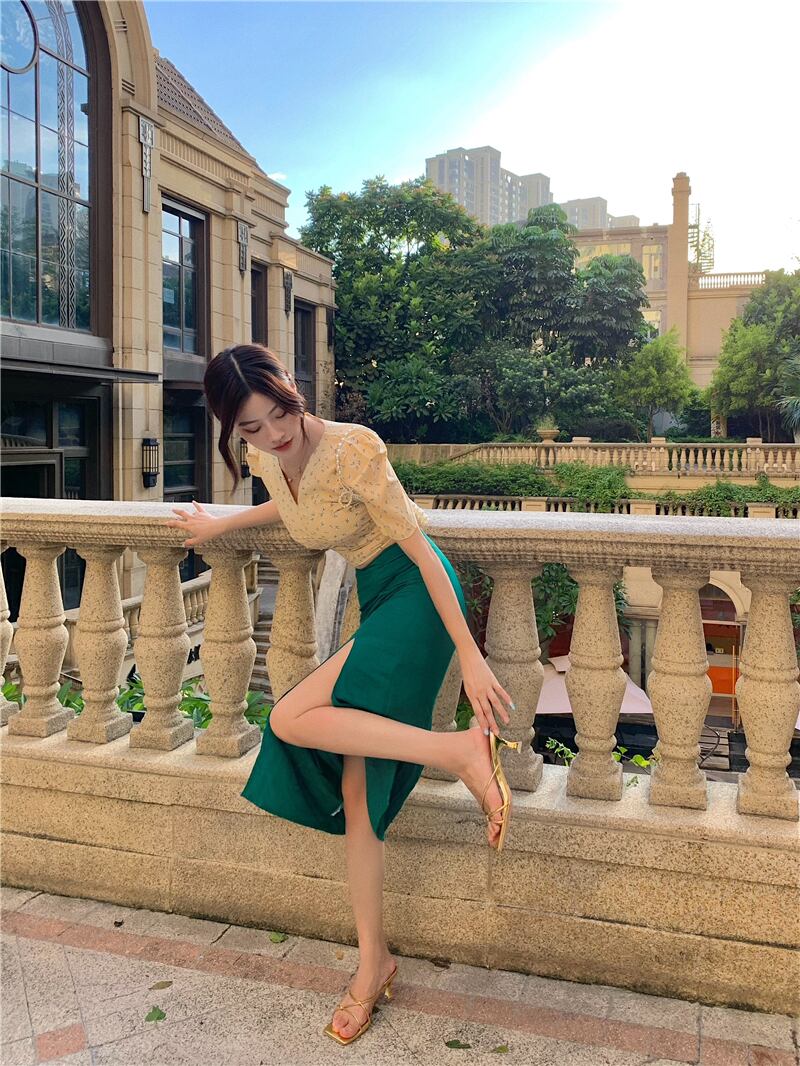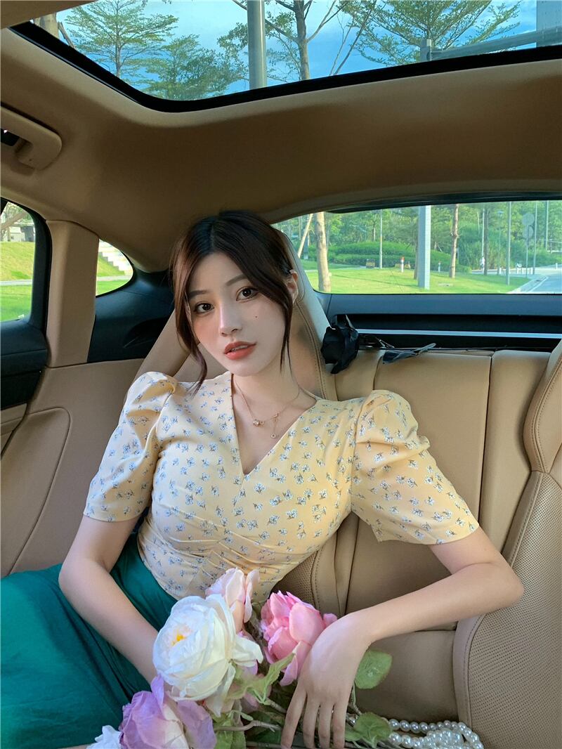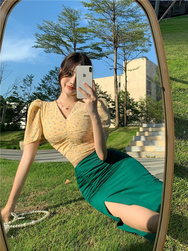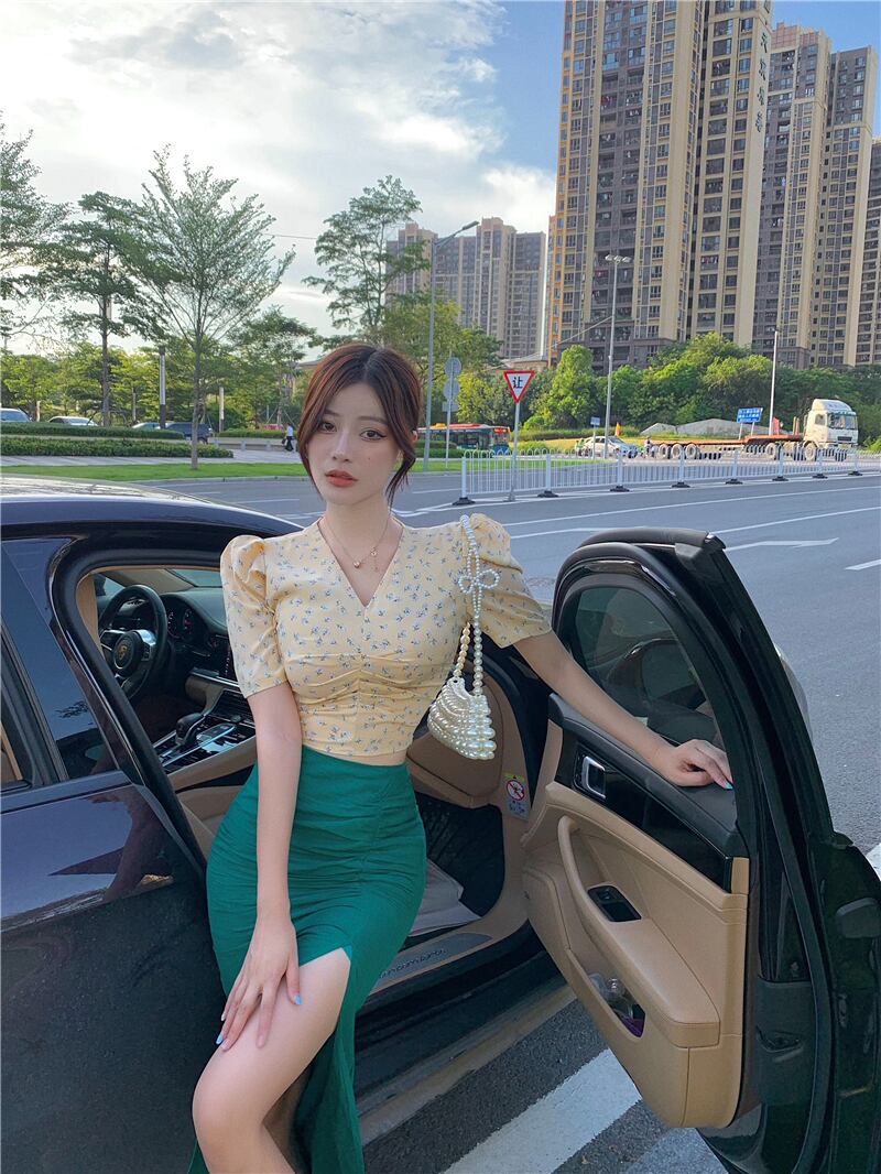 スタンダードフローラルスリーブVネックシャツ ハイウェストウェストスカート レトロ 花柄 ハンチェンe92539013890