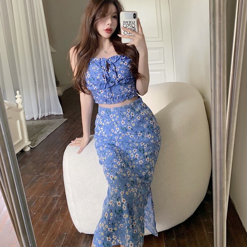 スタンダードフローラルプリント柄トップス ハイウェストウェストスカート レディース レトロ 花柄 ハンチェンe48931329962
