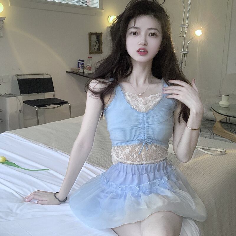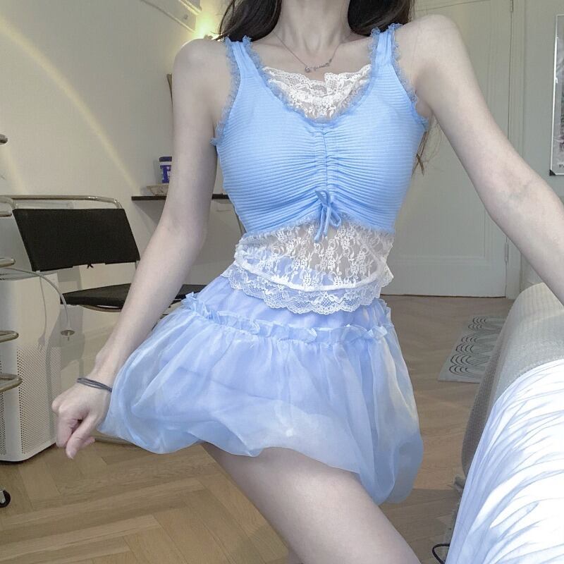 レースハイウェストウェストメッシュAラインスカート ステッチ ハンチェンe87113563940