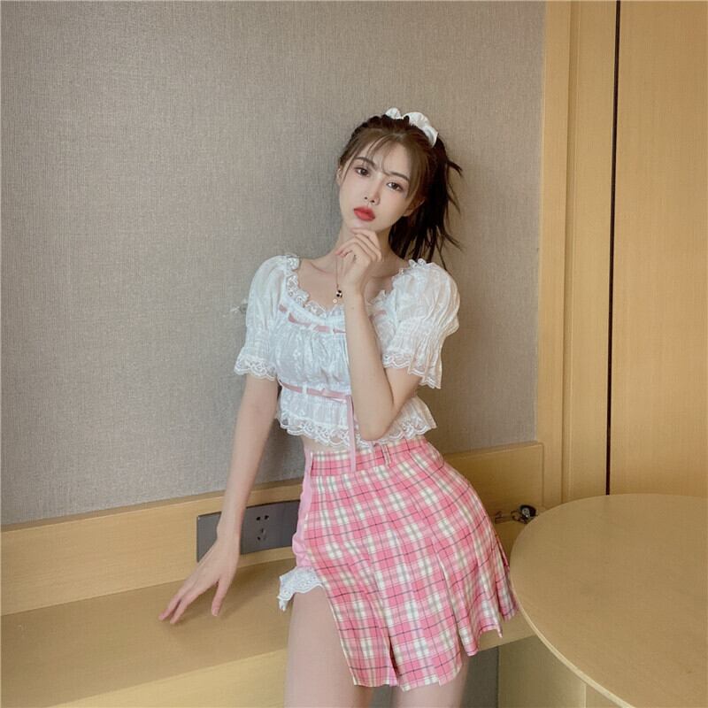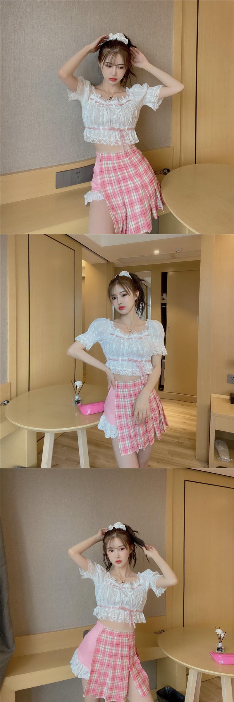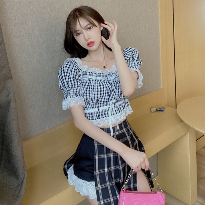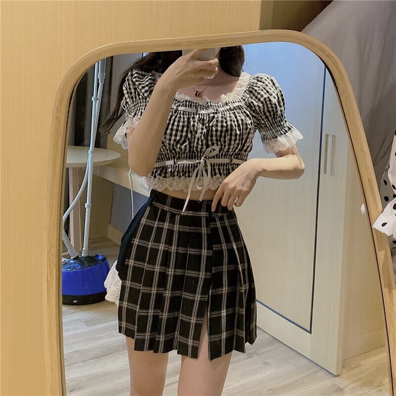 色:ホワイトトップ,チェック柄トップ,黒のチェック柄スカート,赤い格子縞のスカート