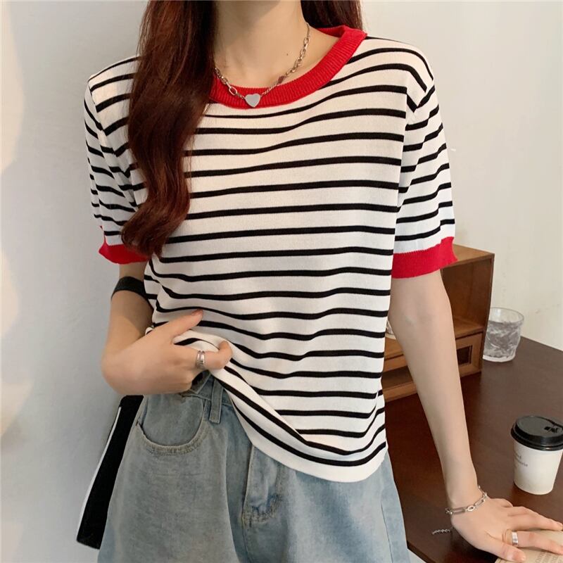 薄手ストライプニットセーター スタイルラウンドネックプルオーバー 半袖スリーブカラールーズブラウス レディース ショート ハーフスリーブ Oネック ハンチェンe6571794136