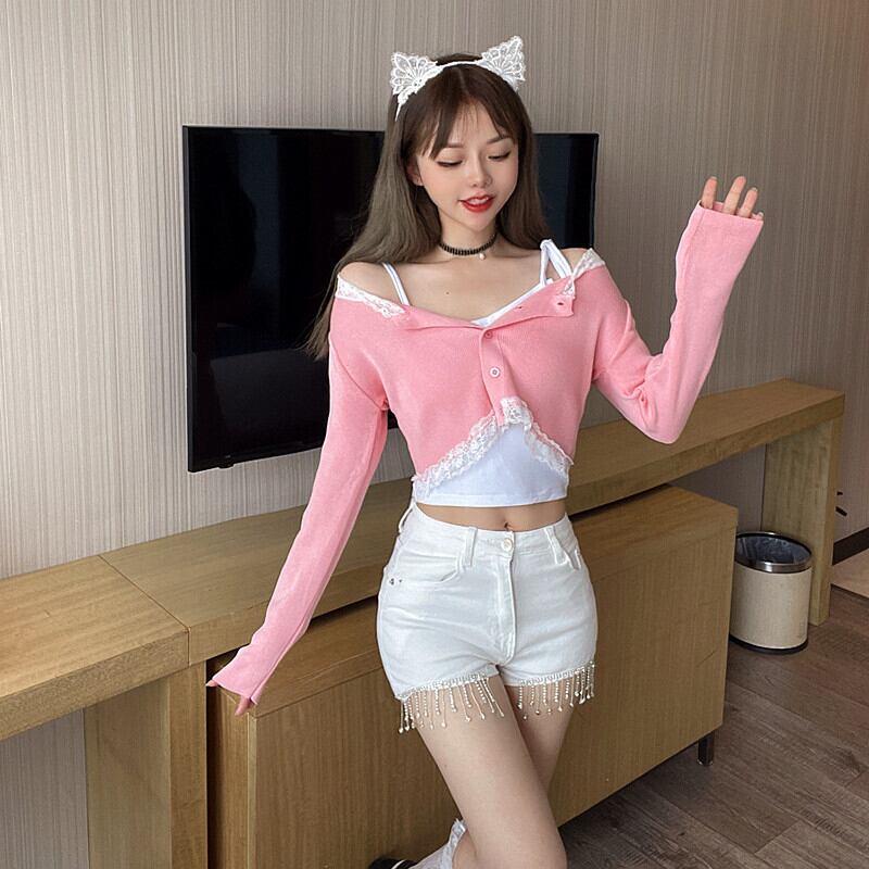 スタイルショートジャケット オータムレースセーター スリムトップス 秋物 ステッチ ハンチェンe22693259457