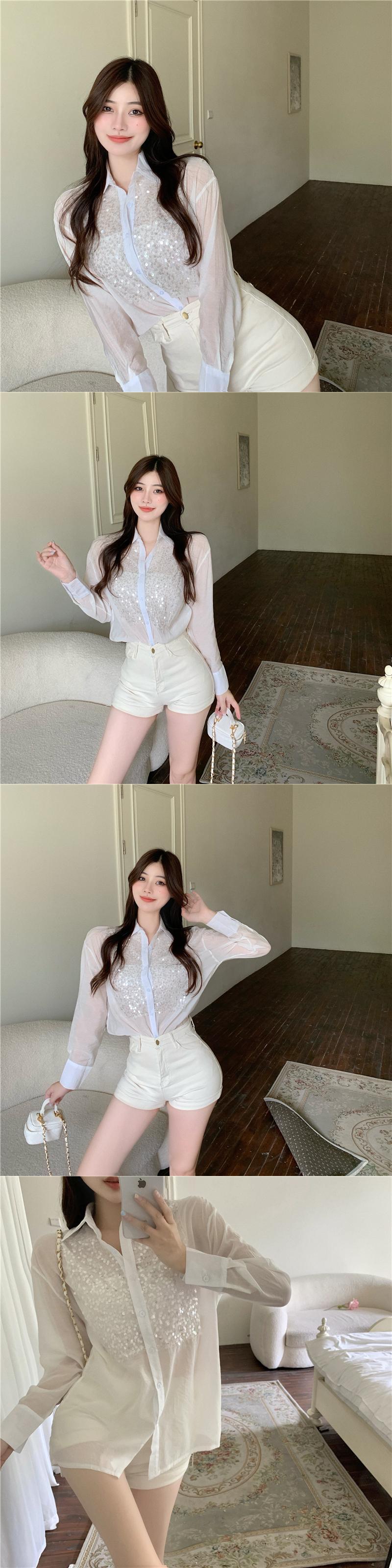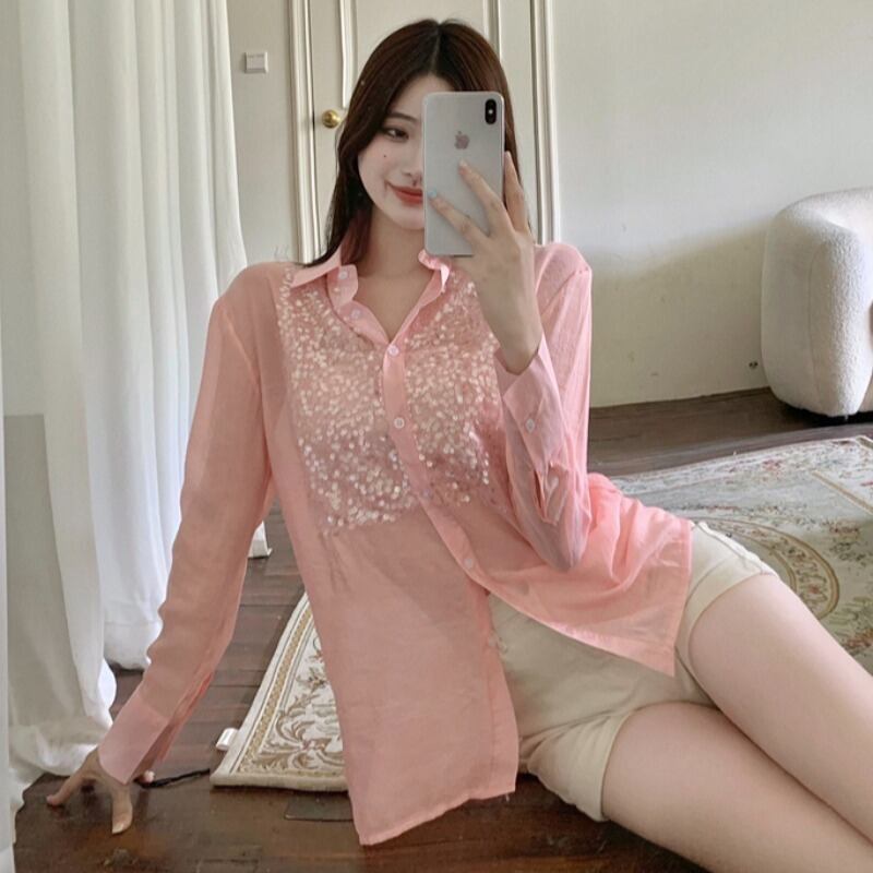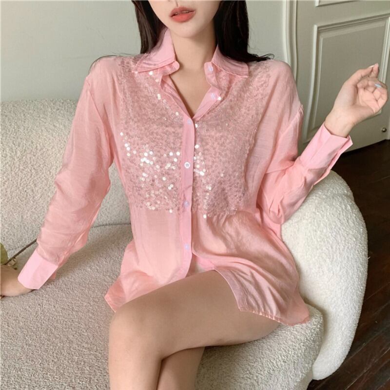 オータム薄手スパンコールシャツ トップス レディース ロング 秋物 ステッチ ハンチェンe81017037829