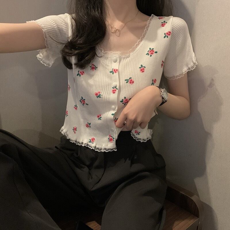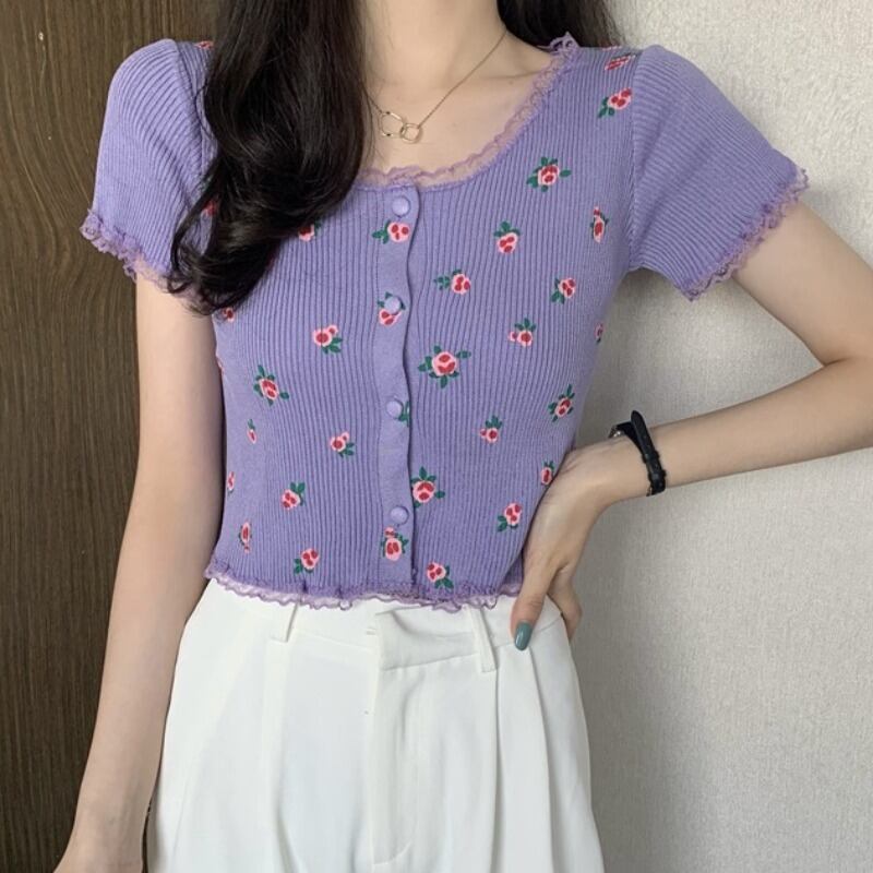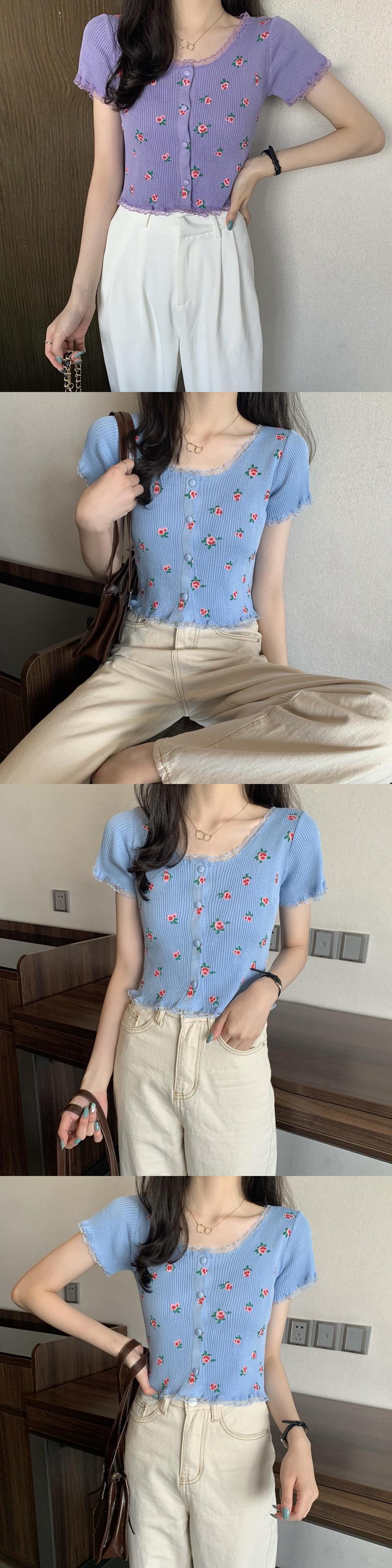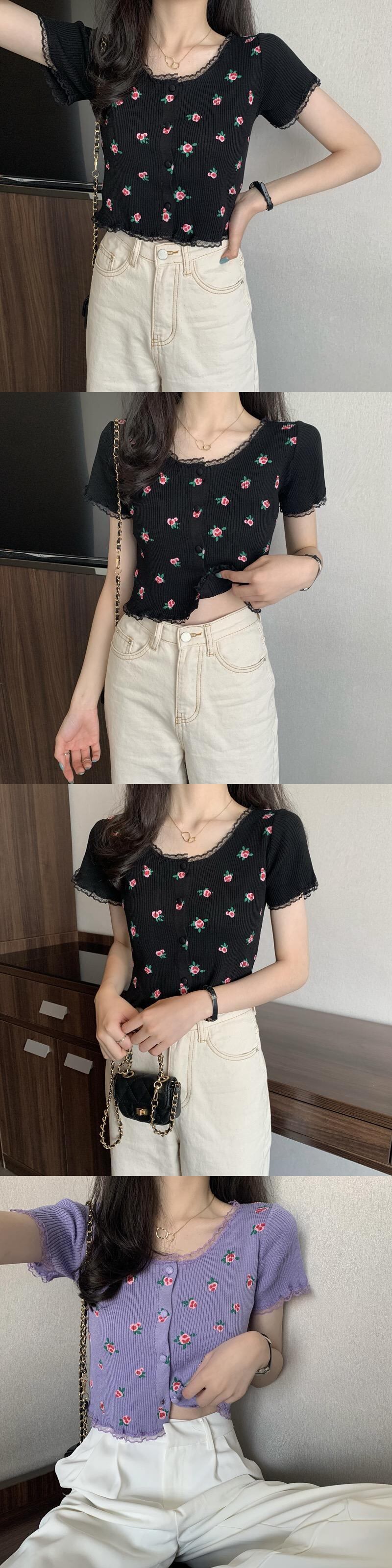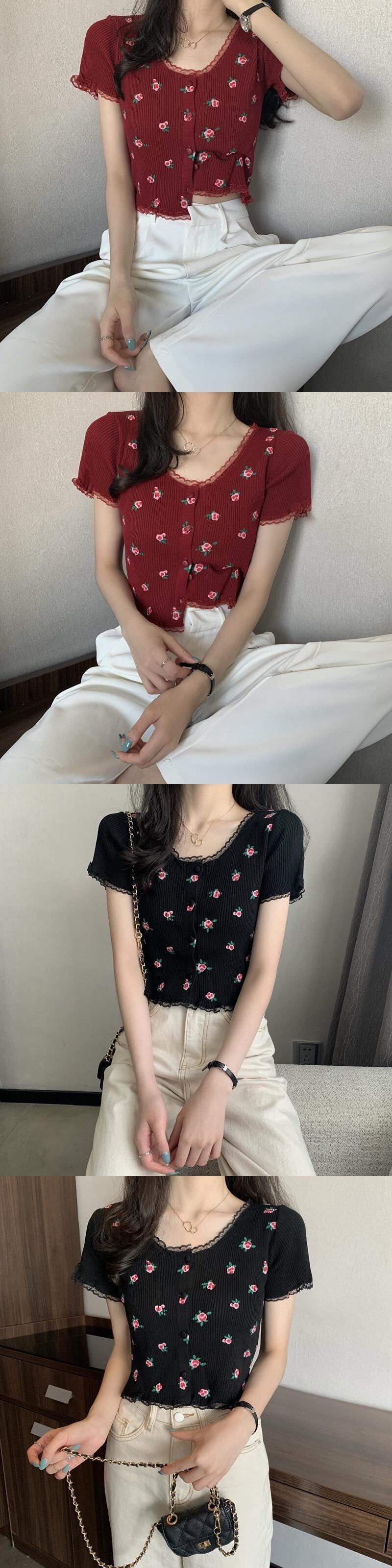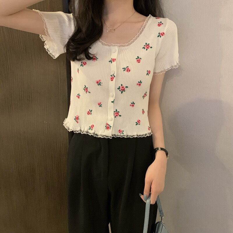 スタンダードニットカーディガンスタイルフローラルショートブラウス レディース レトロ 花柄 ステッチ ハンチェンe8671408469