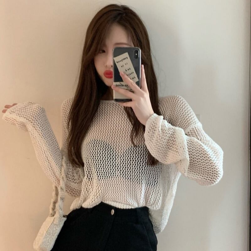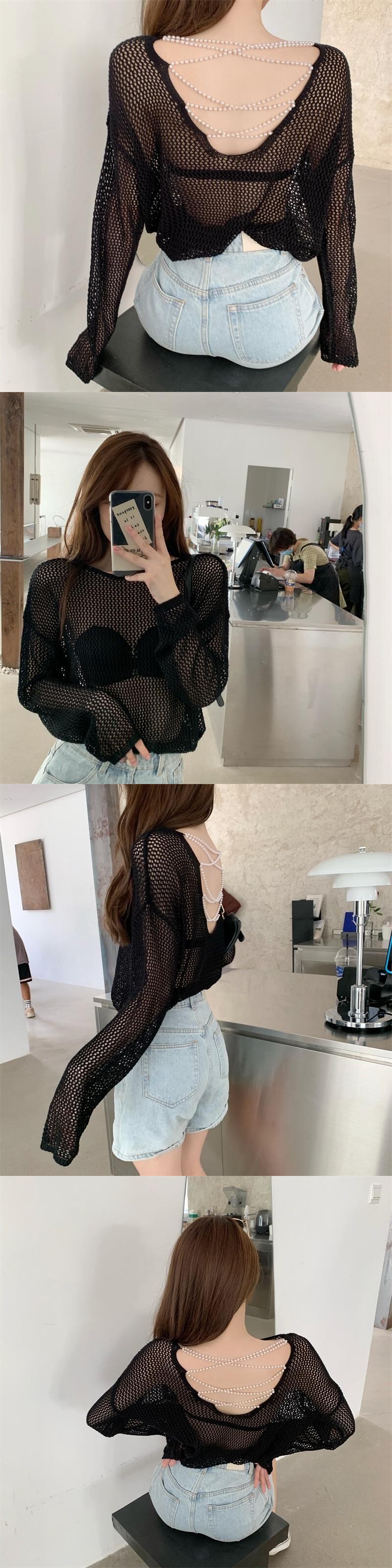オータムパールチェーン バックニットブラウス トップス レディース ロング 秋物 真珠 ハンチェンe5698469545
