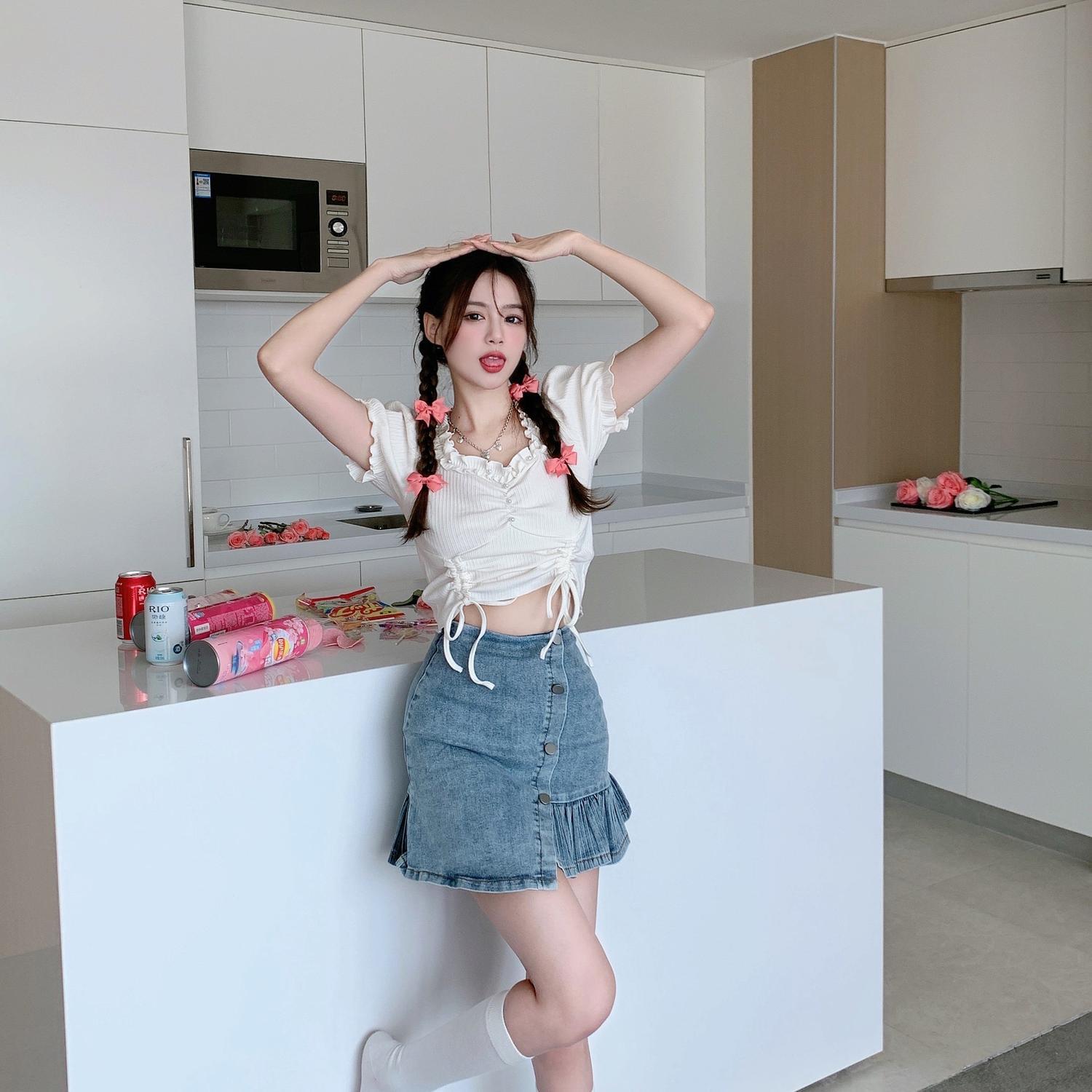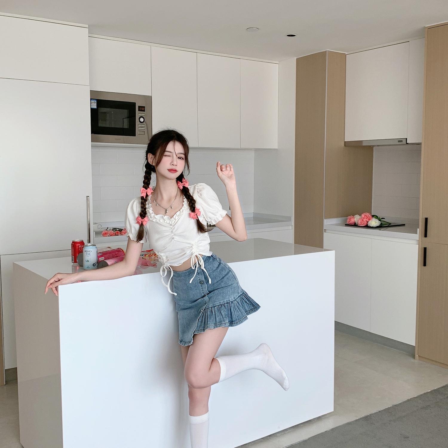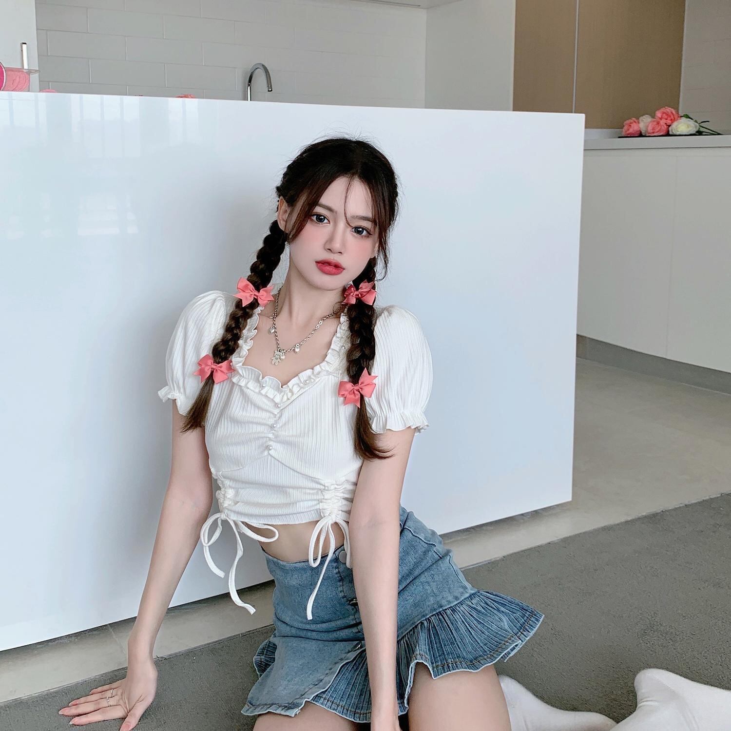 ショートクロップドブラウス レディースサマースタイルスリーブカラーTシャツ 大人ガーリー スウィート キュート カジュアル 夏物 ピュア スクウェア ハンチェンe49212925894