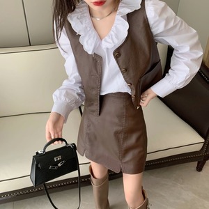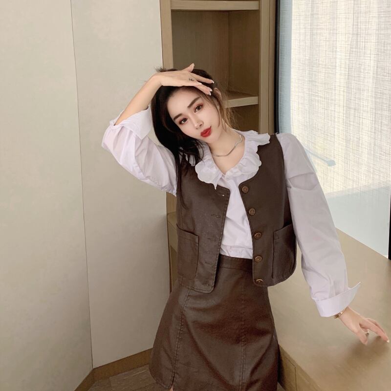 色:ブラウンベスト,茶色のスカート,白のシャツ