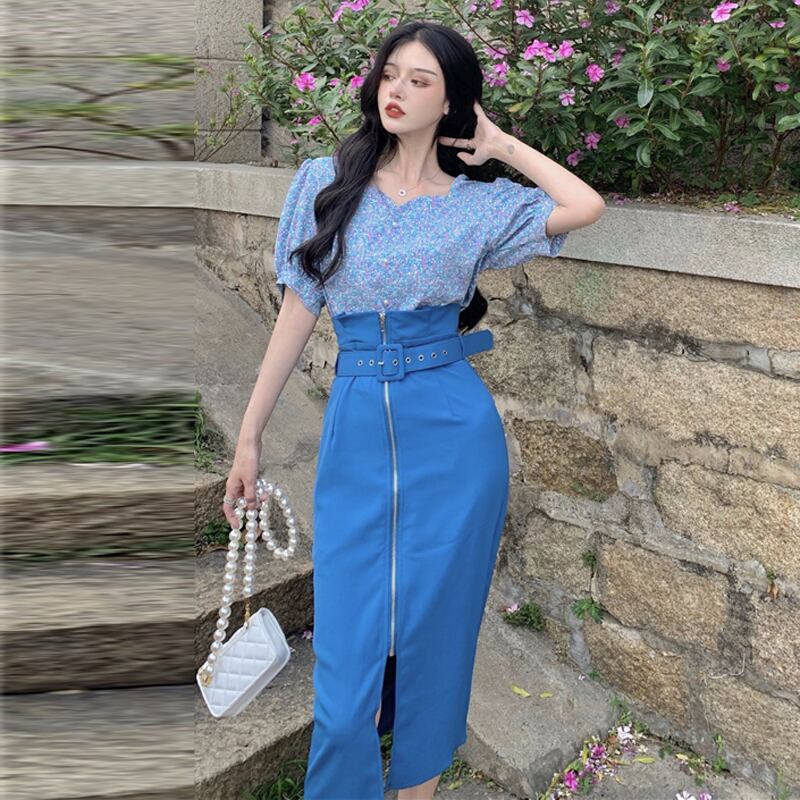 スタイルサマーフローラルシャツ ハイウェストウェストスリムスカート 夏物 花柄 スクウェア ハンチェンe45023301336