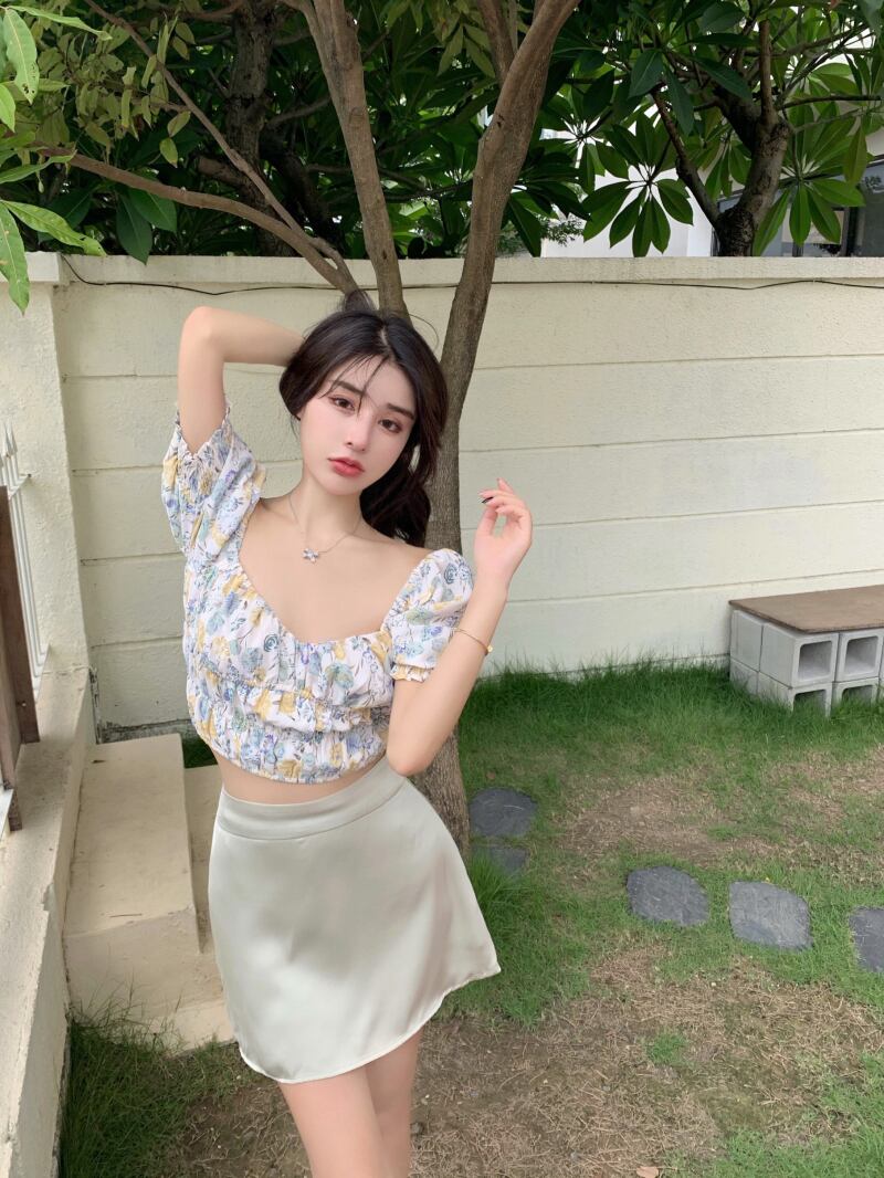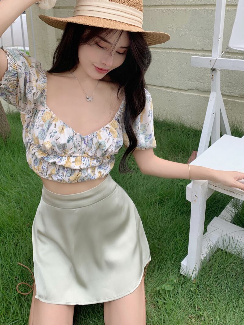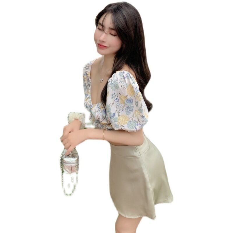 スタイルプリーツスリーブフローラルシフォンシャツ ハイウェストウェスト薄手スカート 花柄 スクウェア ハンチェンe28315759618