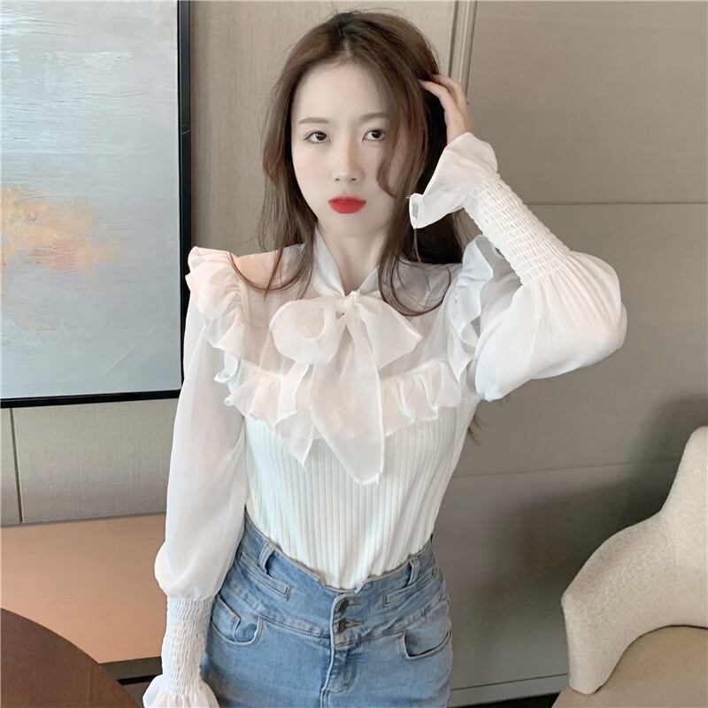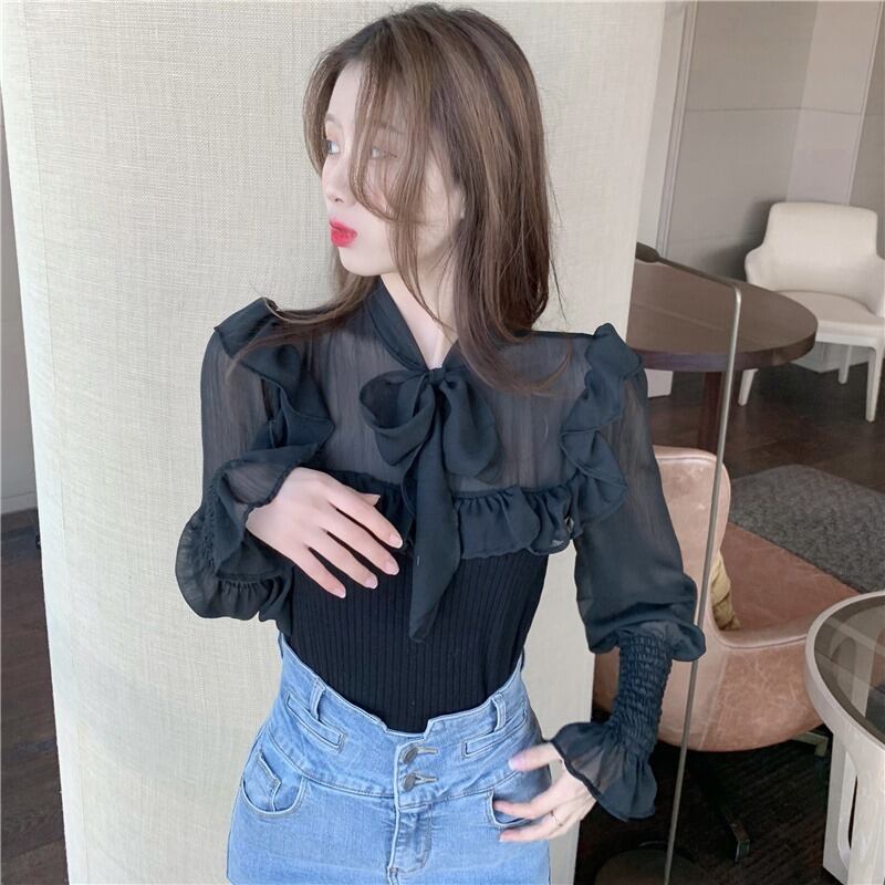 スタンダードリボンブラウス レディースシフォンスリーブスリムシャツ レトロ ステッチ ハンチェンe85021956825
