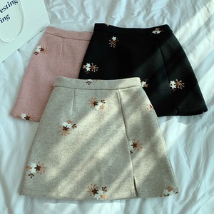 オータムスカート Aラインショート ハイウェスト レッド 刺繍 秋物 ハンチェンe67755461305