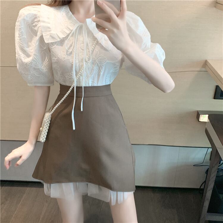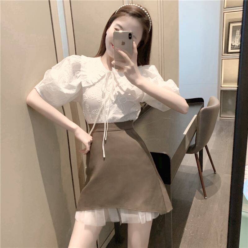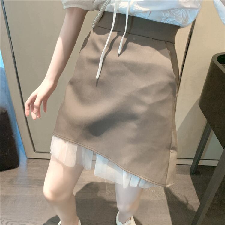 スリーブシャツ ハイウェストウェストブラックメッシュAラインスカート ステッチ ハンチェンe22359112542
