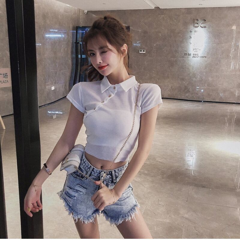 ボタンショートトップス サマーシャツ カラースリムTシャツ 夏物 ハンチェンe49370963039