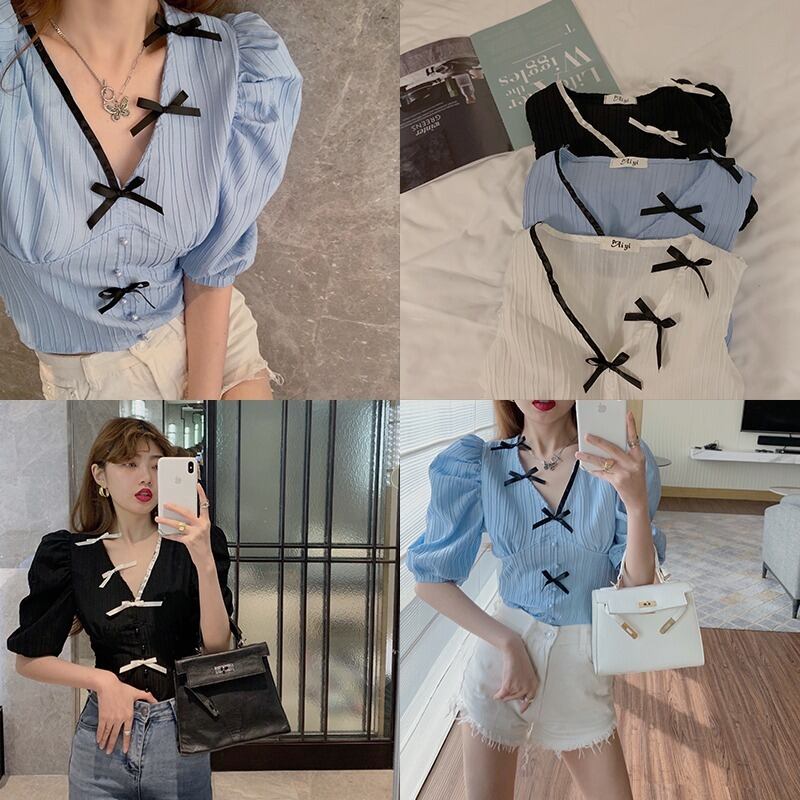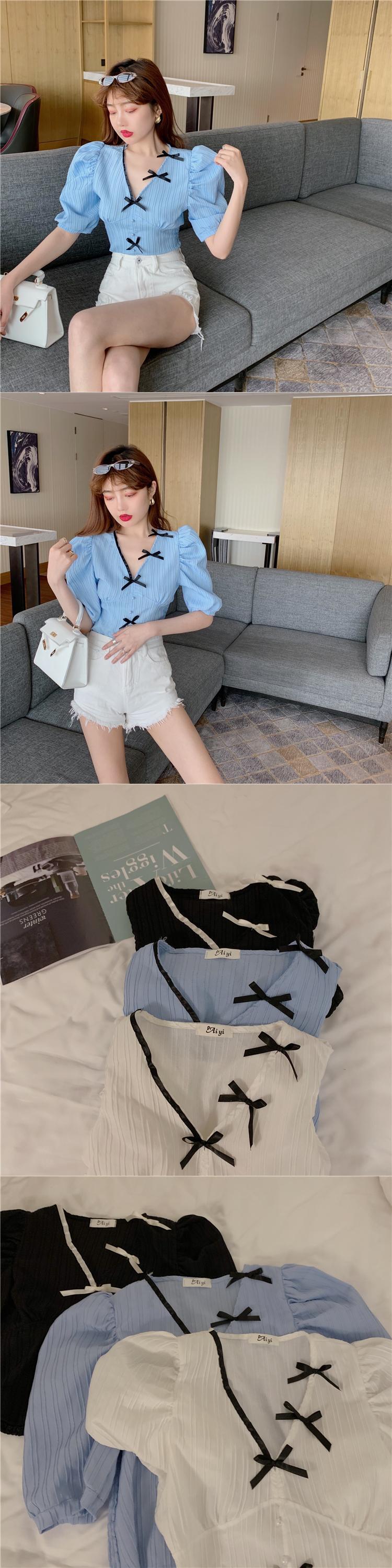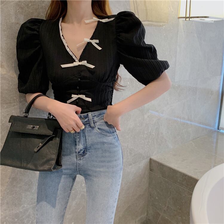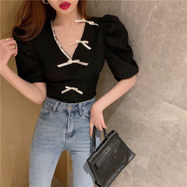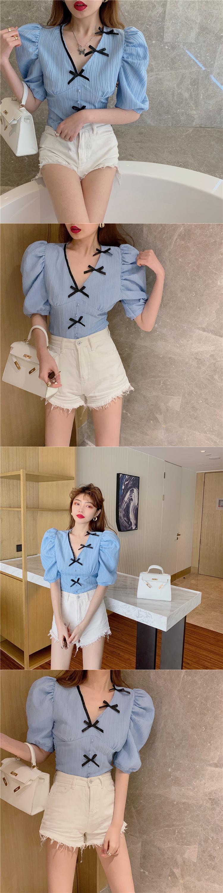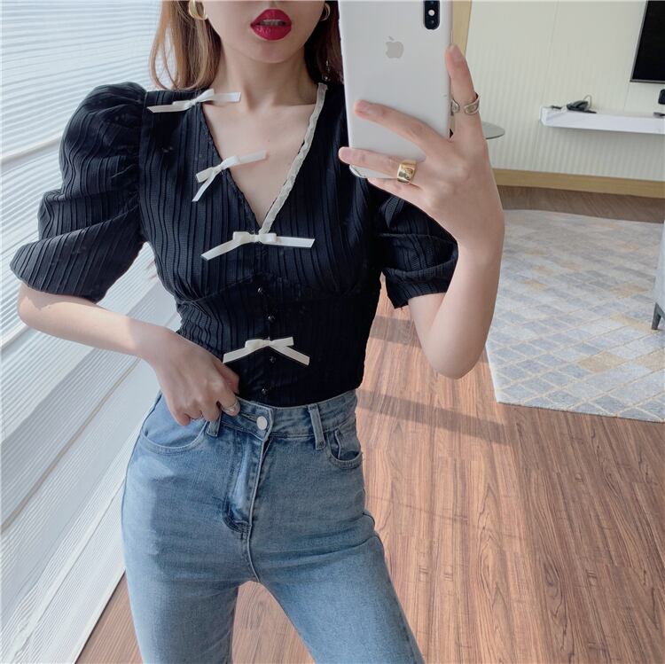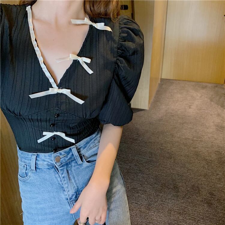スタイルシャツ レディースサマーVネックスリーブショートトップス リボン 夏物 ハンチェンe80547142989