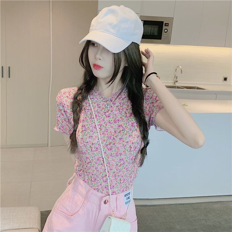 フローラルショートブラウス レディースサマーラウンドネックスリムTシャツ 夏物 花柄 Oネック ハンチェンe7140538696