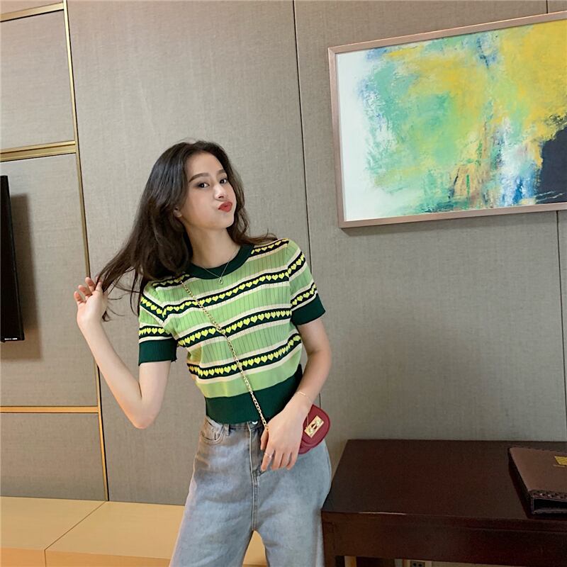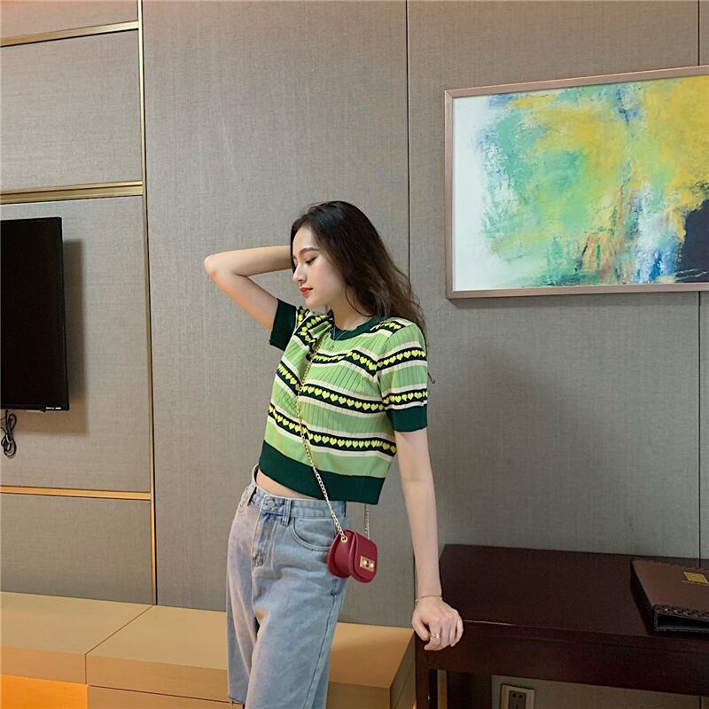ショートTシャツ レディースサマーレッドグリーンニットトップス 夏物 ハンチェンe25638748399