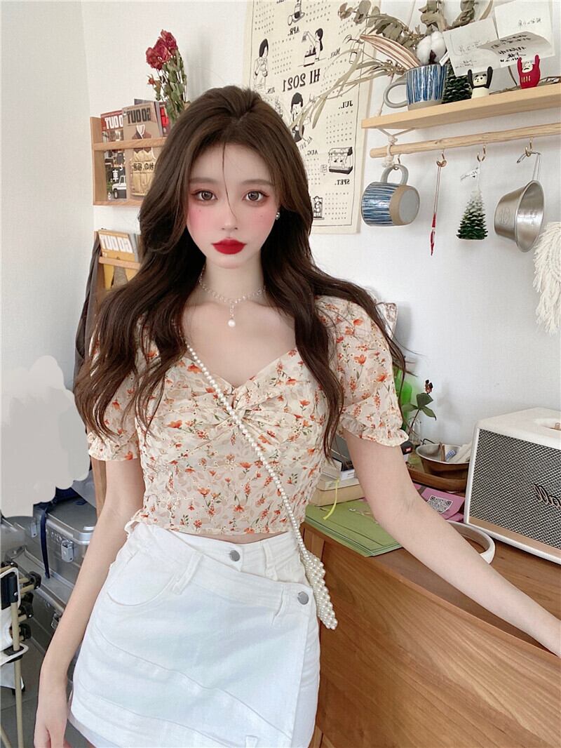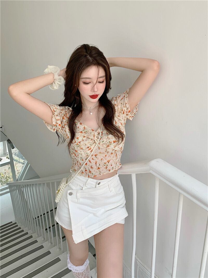 ショートシャツ サマースタイルVネックフローラルトップス レディース 夏物 花柄 ハンチェンe80799504556