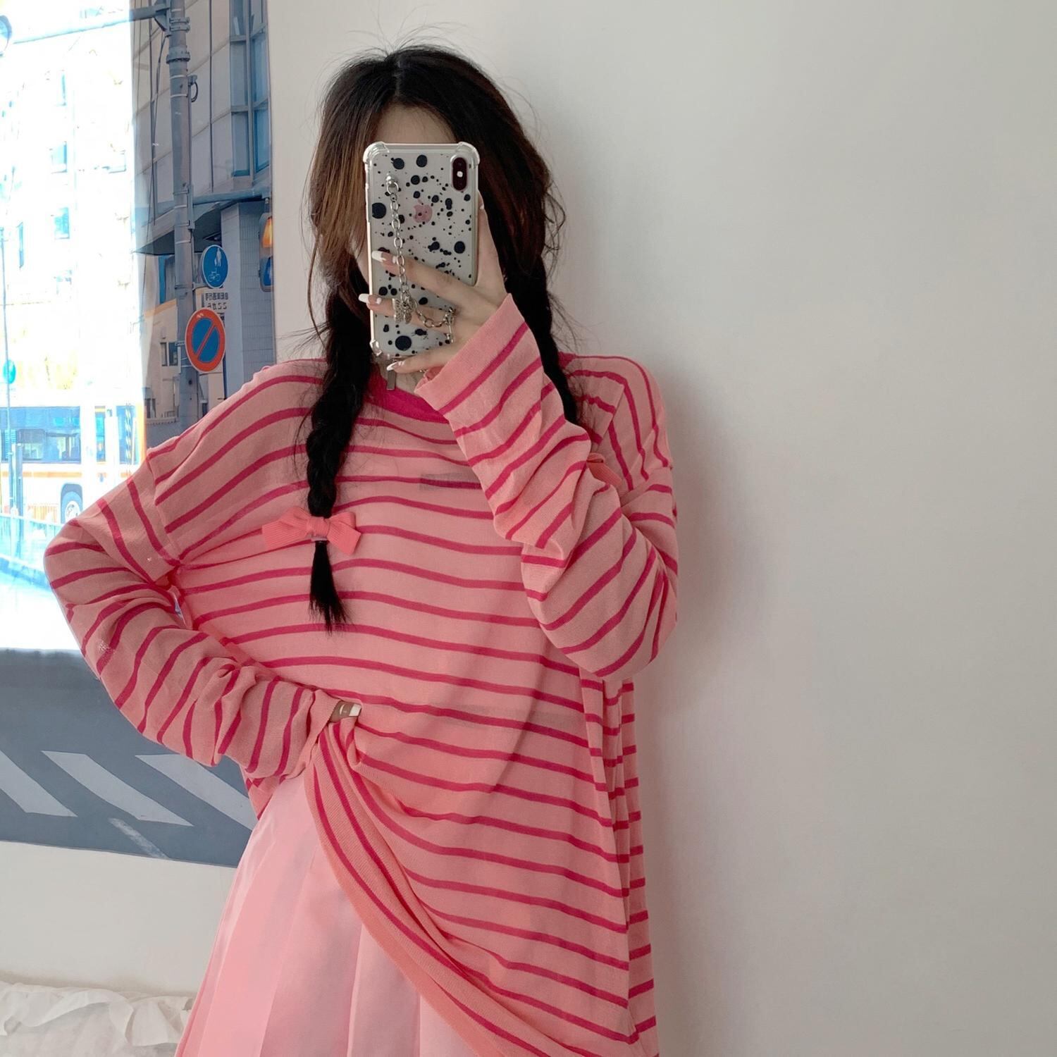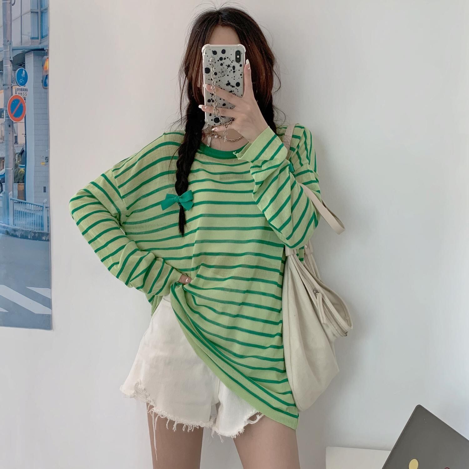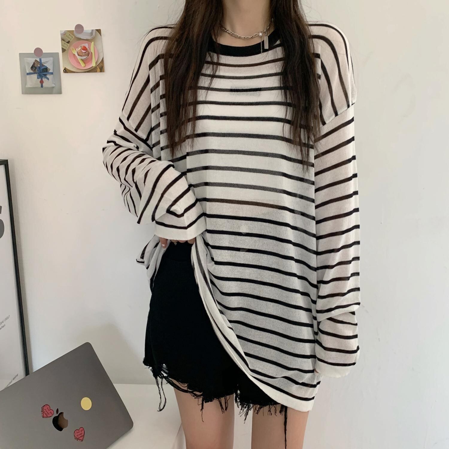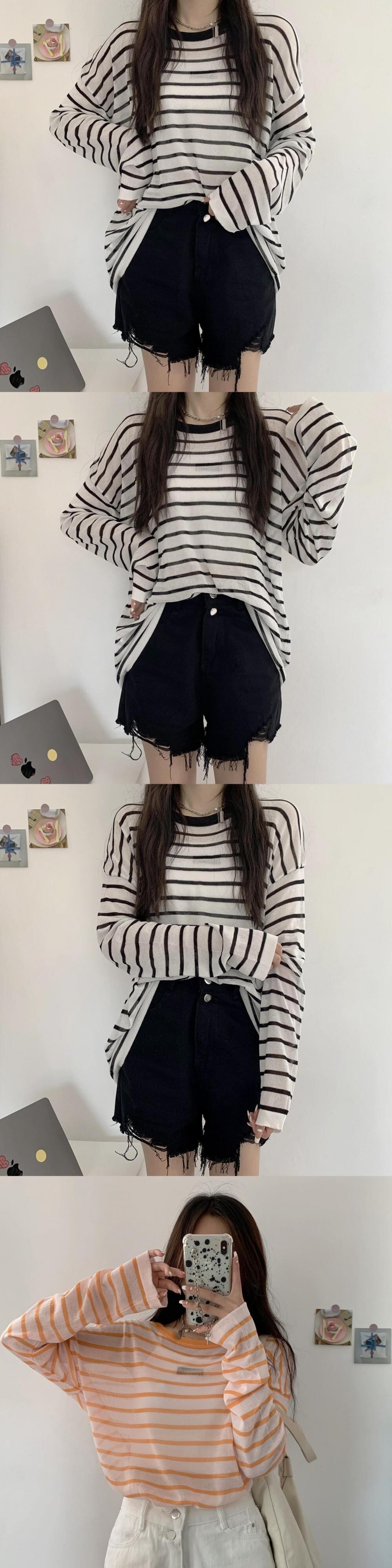 サマースタイルラウンドネック長袖スリーブルーズストライププルオーバー ニットトップス レディース ロング 夏物 Oネック ハンチェンe8993943118